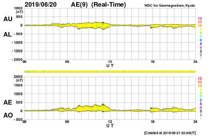 (c) SDO (NASA)、作図:宇宙天気ニュース ![]() SDO衛星のAIA193カメラによる太陽コロナの様子 (c) SDO (NASA) ![]() SDO衛星による太陽の可視光写真 (c) SDO (NASA) ![]() DSCOVRが観測した太陽風の磁場(1番上の枠、黒線は全体の強度、赤線は南北成分) および、太陽風の密度(3番目の紫線)、速度(4番目の青線) (c) データ:NOAA/SWPC、作図:宇宙天気ニュース ![]() AE指数(速報値) 下段のAEグラフの値が高くなると、オーロラ活動が活発化しています。 (c) 京都大学WDC ![]() ![]() 27日の太陽周期に合わせたデータプロット 太陽が同じ面を地球に向けていた27日前の変化から、今後を予想することができます。 (c) 作図:宇宙天気ニュース