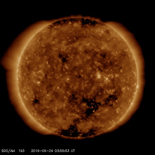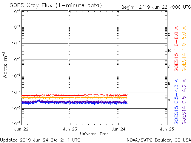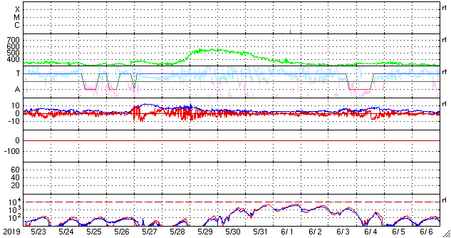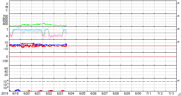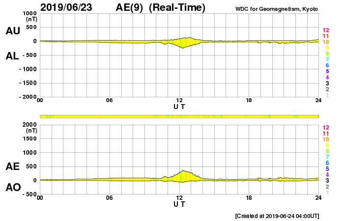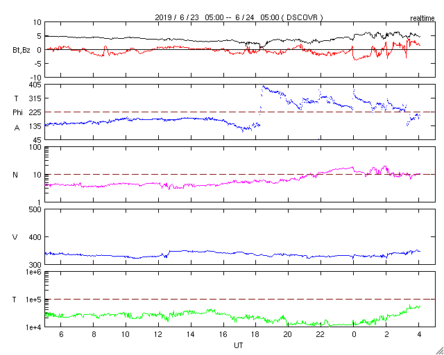 2019/ 6/24 13:11 更新 太陽に小さい黒点が発生しています。太陽風は低速です。 担当 篠原 太陽の中央部、少し西寄り(右寄り)に、 今日の未明から小さい黒点が現れています。 掲載の可視光写真でも、なんとか見えるくらいです。 発生緯度は赤道に近く、現在の第24期の特徴を持つ黒点です。 今朝のNOAAの報告書では、 黒点群の番号は付けられていませんでした。 明日以降どうなるでしょうか。 WDC-SILSOの黒点相対数の速報値でも、 黒点の発生は確認されています。 SILSOの記録では、5月29日以来の黒点です。 X線グラフに特に変化はなく、 太陽は静かな状態が続いています。 太陽風は、330〜350km/秒の低速の風が続いています。 磁場強度は、5nTから2nTに下がって、再び5nTに戻っています。 磁気圏は静穏で、AE指数は小規模の変化が1度起きた程度です。 SDO衛星AIA193の太陽コロナ写真の 太陽の南西(右下)に見えるコロナホールの影響が近付いています。 27日周期の図の前周期の変化を参考にすると、 今夜か明日の朝くらいに速度の高まりが始まる可能性があります。 今後の推移に注目してください。 ![]() SDO衛星のAIA193カメラによる太陽コロナの様子 (c) SDO (NASA) ![]() SDO衛星による太陽の可視光写真。マウスの矢印を写真に重ねると、黒点番号付きの写真に切り替わります。 (c) SDO (NASA) ![]() GOES衛星の太陽X線データ (c) NOAA/SWPC ![]() DSCOVRが観測した太陽風の磁場(1番上の枠、黒線は全体の強度、赤線は南北成分) および、太陽風の密度(3番目の紫線)、速度(4番目の青線) (c) データ:NOAA/SWPC、作図:宇宙天気ニュース ![]() AE指数(速報値) 下段のAEグラフの値が高くなると、オーロラ活動が活発化しています。 (c) 京都大学WDC ![]() ![]() 27日の太陽周期に合わせたデータプロット 太陽が同じ面を地球に向けていた27日前の変化から、今後を予想することができます。 (c) 作図:宇宙天気ニュース