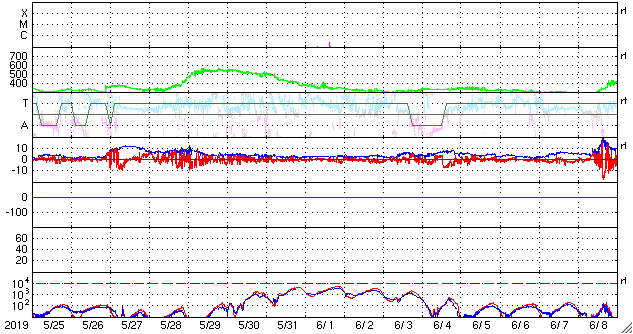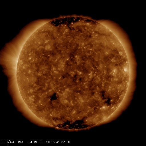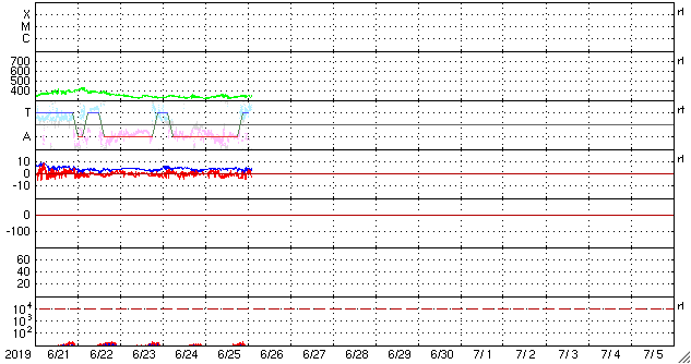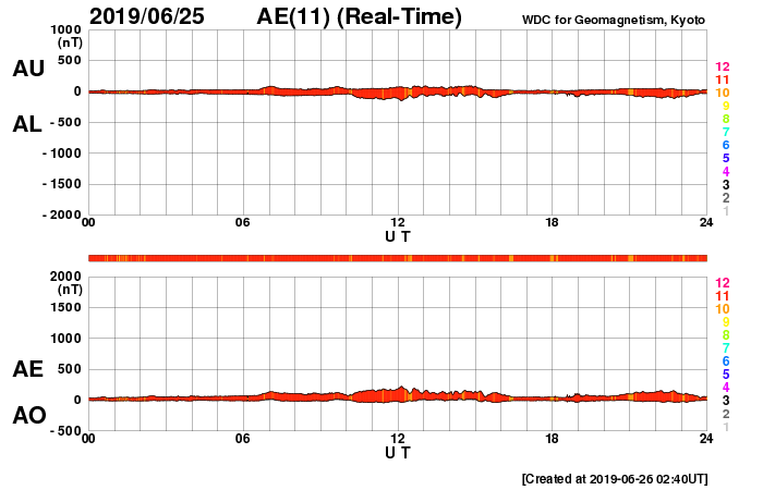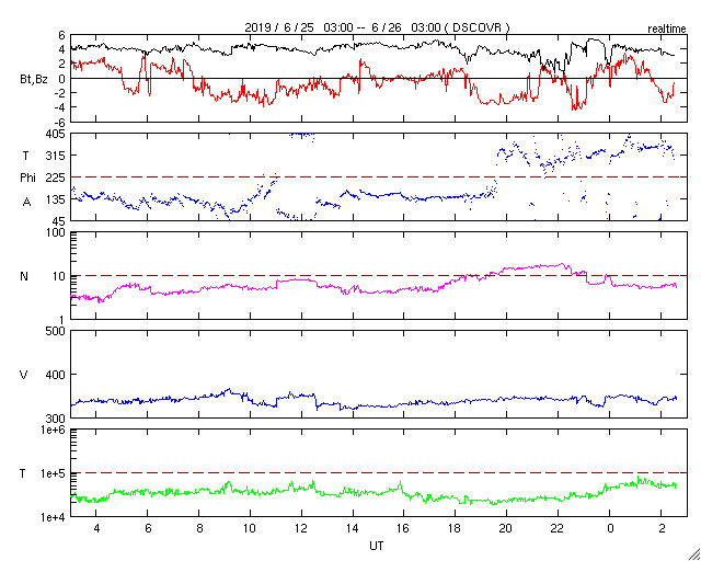 2019/ 6/26 11:47 更新 2743黒点群は小さくなっています。低速の太陽風が続いています。 担当 篠原 太陽の2743黒点群は、 小さくなりながら西の端に近付いています。 このまま沈むと、太陽は無黒点に戻りそうです。 X線グラフも変化はなく、太陽は穏やかです。 太陽風は、340km/秒の低速状態が続いています。 磁場強度も、3〜4nTとやや弱い状態で安定しています。 27日周期の図を見ると、 前周期の太陽風は既に速度が高まっていて、 今回はこの変化は消えてしまった様です。 磁気圏も穏やかな状態が続いていて、 AE指数は目立った変化は見られません。 SDO衛星AIA193では、 東側(左側)にかけてコロナホールは見られず、 太陽風は低速の状態が続きそうです。