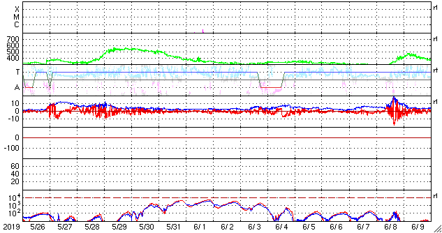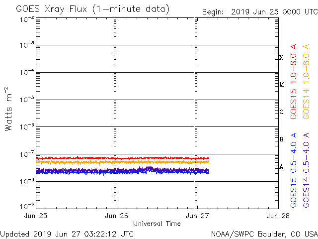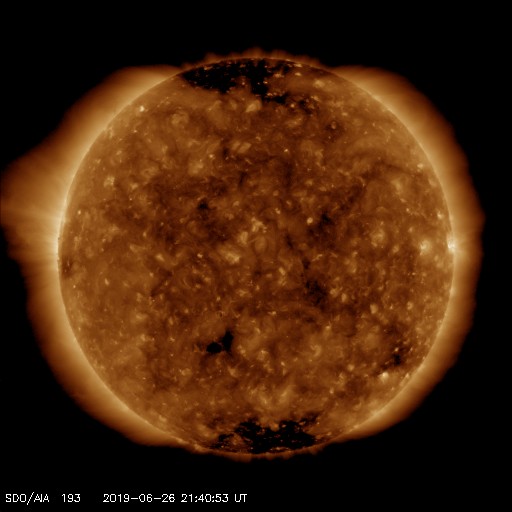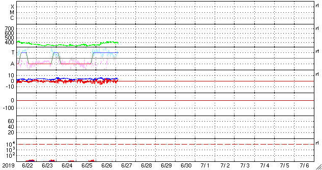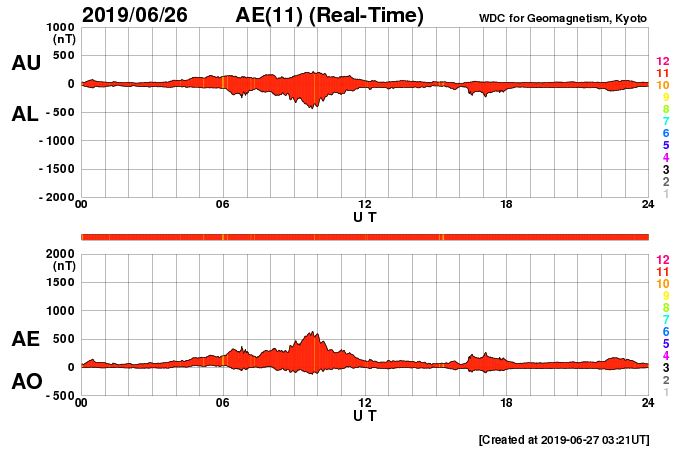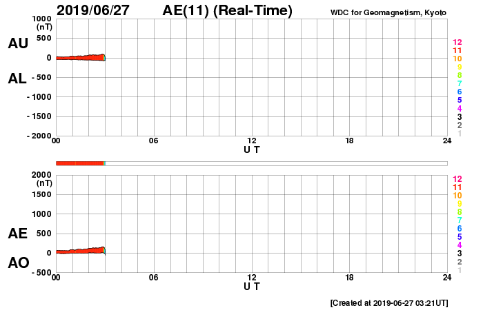 2019/ 6/27 12:30 更新 太陽は無黒点に戻りました。太陽風は平均的な速さになっています。 担当 篠原 2743黒点群は、太陽の西の端に達して、 掲載の可視光写真では見えなくなっています。 太陽は無黒点に戻っています。 X線グラフに変化はなく、 SDO衛星AIA193も全体がぼんやりと光っているだけです。 太陽風は、昨日の午後に速度が少し上がり、 400km/秒と平均的な状態に戻っています。 磁場強度も、4〜5nTと平均的な状態です。 磁場の南北成分は、 グラフの最初に南向きにやや強まった時間帯があり、 AE指数では、この頃に600nTの中規模の変化が発生しています。 その他は、磁場は0nT付近で、磁気圏も穏やかです。 前周期の太陽風速度の高まりに関係する変化でしょうか。 この後は、再び速度が下がって、低速風になりそうです。
