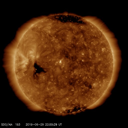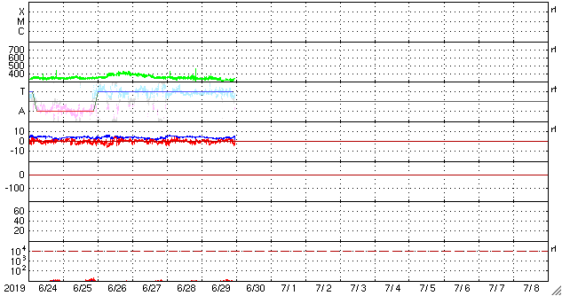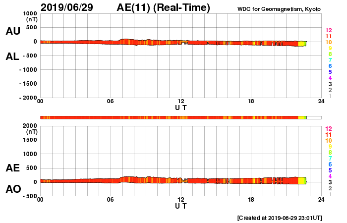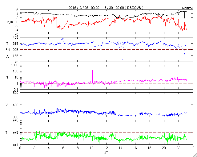 2019/ 6/30 08:11 更新 太陽風は低速風が続いています。太陽は無黒点です。 担当 篠原 太陽風の速度は、310km/秒付近まで下がっています。 更に低速になっています。 磁場強度は、5nTから2nTに下がって、また5nTに戻っています。 こちらも穏やかに推移しています。 磁気圏は静穏で、AE指数は目立った変化は起きていません。 SDO衛星AIA193では、 東側(左側)の赤道域にコロナホールの暗い領域が見えています。 あと2日ほどで太陽の中心線に達して、 その3日後くらいに影響が始まりそうです。 27日周期の図を見ると、 前周期の6月8〜9日に太陽風速度の高まりが到来しています。 この時は発生源がよく分からなかったのですが、 この領域が関係していたのかもしれません。 太陽は、昨日見えていた小さい黒点は、 夜なるとに消えてしまい、 現在は無黒点に戻っています。 X線グラフの変化もなく、太陽は穏やかです。 現在、乗り継ぎのためダラスにいます。 鹿児島空港を出発してちょうど24時間経ちました。 もう2時間ほどでサンチャゴ行きに乗ります。 次も10時間ほどのフライトです。