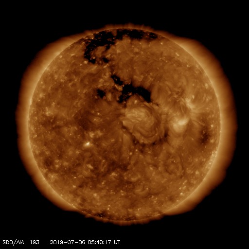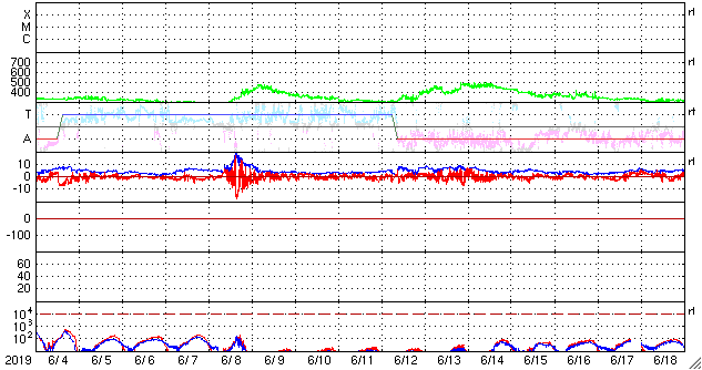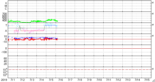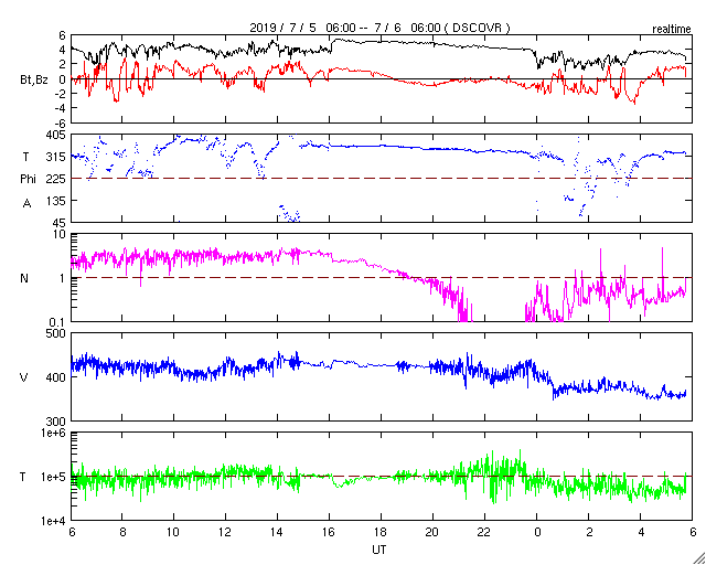 2019/ 7/ 6 14:52 更新 太陽風の速度は下がって、低速風になっています。 担当 篠原 太陽風の速度は、今朝までは400km/秒台を保っていましたが、 その後低下して、現在は350km/秒と低速風に戻っています。 太陽風速度の高まりは、前周期よりも小さくなっていた様です。 磁場強度も、5nTから4nTへやや下がっています。 磁場の南北成分の変化は小さく、磁気圏は穏やかで、 AE指数は小規模の変化が2〜3回起きている程度です。 SDO衛星AIA193では、 北半球側のコロナホールが太陽の中央線を越えて、 西半球側に進んでいます。 地球への影響は、明後日くらいからとなりそうです。 27日周期の図では、 前周期の6月13〜14日に太陽風速度の高まりが到来しています。 今回はコロナホールの広がりが27日前よりも大きくなっているので、 太陽風への影響も強まる可能性があります。 太陽は無黒点で、穏やかな状態が続いています。 今日の昼過ぎに成田に着きました。 これから鹿児島へ移動します。 成田は小雨で気温もあまり高くなく、 冬から夏へ変わる驚きはありませんでした。