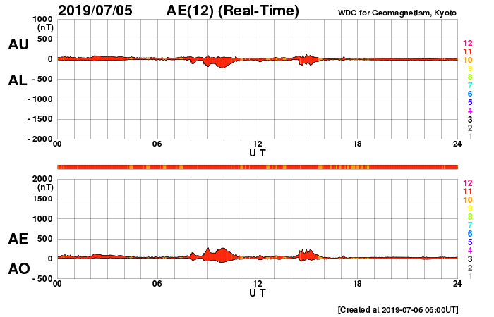 (c) SDO (NASA) ![]() SDO衛星による太陽の可視光写真 (c) SDO (NASA) ![]() DSCOVRが観測した太陽風の磁場(1番上の枠、黒線は全体の強度、赤線は南北成分) および、太陽風の密度(3番目の紫線)、速度(4番目の青線) (c) データ:NOAA/SWPC、作図:宇宙天気ニュース ![]() AE指数(速報値) 下段のAEグラフの値が高くなると、オーロラ活動が活発化しています。 (c) 京都大学WDC ![]() ![]() 27日の太陽周期に合わせたデータプロット 太陽が同じ面を地球に向けていた27日前の変化から、今後を予想することができます。 (c) 作図:宇宙天気ニュース