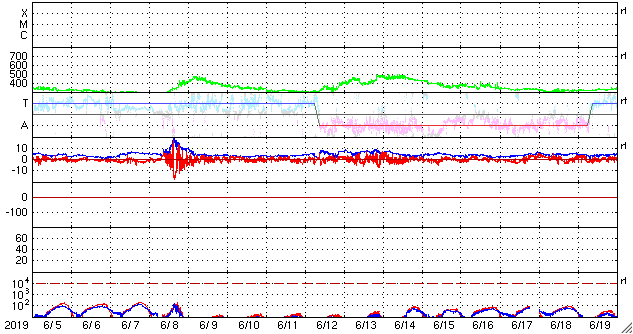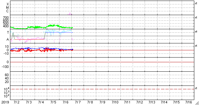 2019/ 7/ 6 14:52 太陽風の速度は下がって、低速風になっています。