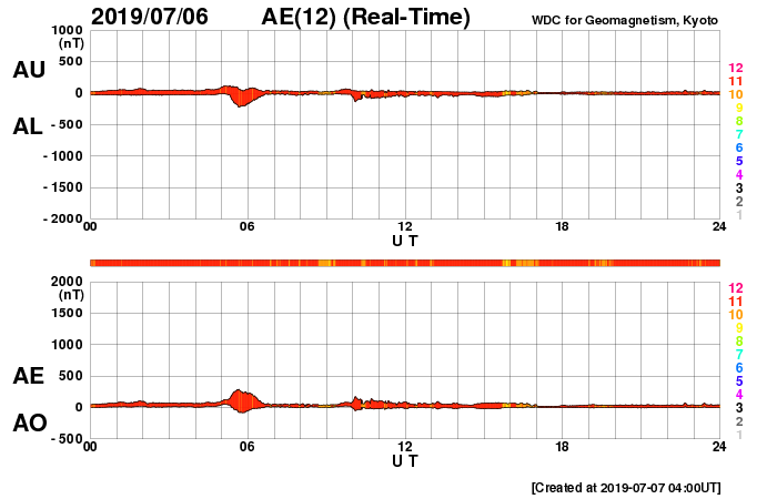 下段のAEグラフの値が高くなると、オーロラ活動が活発化しています。