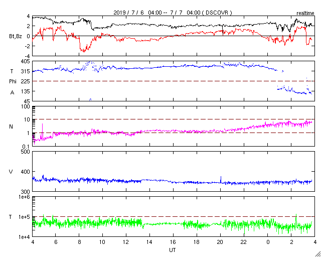 2019/ 7/ 5 22:11 太陽風は平均的な速度に変わっています。太陽は無黒点です。