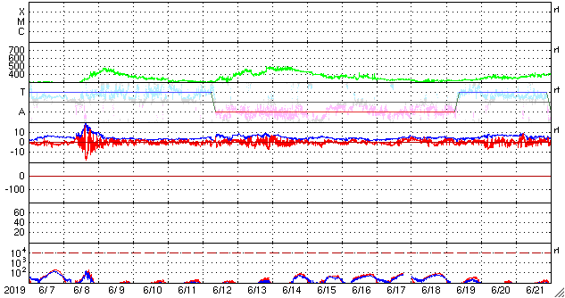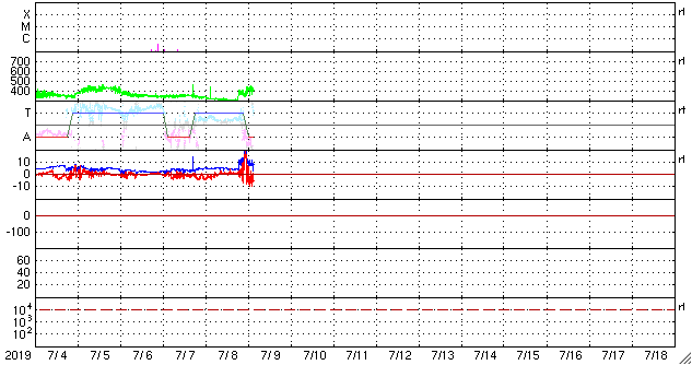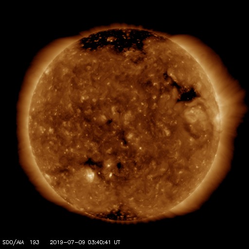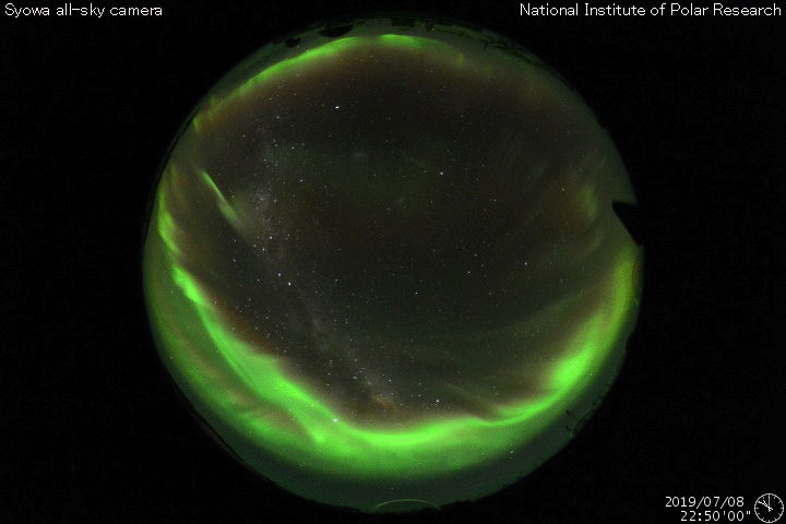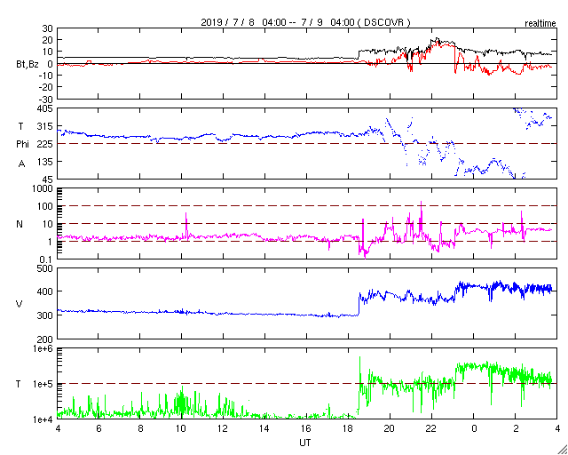 2019/ 7/ 9 12:59 更新 太陽風の小規模の変化が到来しています。太陽は無黒点になっています。 担当 篠原 今日未明、9日4時(世界時8日19時)頃に、 太陽風の急な変化が到来して、 速度は300km/秒から400km/秒へ、 磁場強度は、4nTから10nTへそれぞれ高まっています。 ただし、変化としては小幅で、 速度は平均的な状態に戻った程度です。 太陽風磁場の南北成分は、 変化が到来した直後は北寄りでしたが、 その度南寄りになり、-10nT近い南向きの変化も発生しています。 磁気圏の活動は、 AE指数の最後に700nTの中規模の変化が発生しています。 この700nTの変化の前の時間帯ですが、 昭和基地の全天カメラでは、 世界時8日23時頃にオーロラの高まりが観測されています。 太陽風の高まりは、この後どの様に推移するでしょうか。 引き続き注目してください。 太陽は、昨日の夕方くらいに2744群の黒点が見えなくなり、 無黒点になっています。 一方、SDO衛星AIA193では、 2744群のあった場所の右側に、明るい点が2か所発生しています。 更に発達して、黒点が現れるでしょうか。 ![]() 南極・昭和基地の全天カメラで、世界時8日23時に撮影されたオーロラ。 (c) 国立極地研究所、(動画加工 : 宇宙天気ニュース) ![]() SDO衛星のAIA193カメラによる太陽コロナの様子 (c) SDO (NASA) ![]() SDO衛星による太陽の可視光写真 (c) SDO (NASA) ![]() DSCOVRが観測した太陽風の磁場(1番上の枠、黒線は全体の強度、赤線は南北成分) および、太陽風の密度(3番目の紫線)、速度(4番目の青線) (c) データ:NOAA/SWPC、作図:宇宙天気ニュース ![]() AE指数(速報値) 下段のAEグラフの値が高くなると、オーロラ活動が活発化しています。 (c) 京都大学WDC ![]() ![]() 27日の太陽周期に合わせたデータプロット 太陽が同じ面を地球に向けていた27日前の変化から、今後を予想することができます。 (c) 作図:宇宙天気ニュース