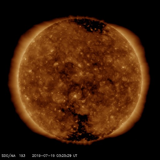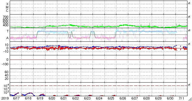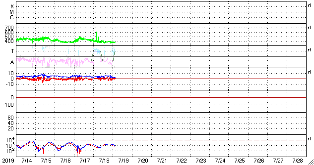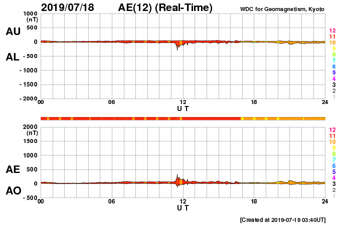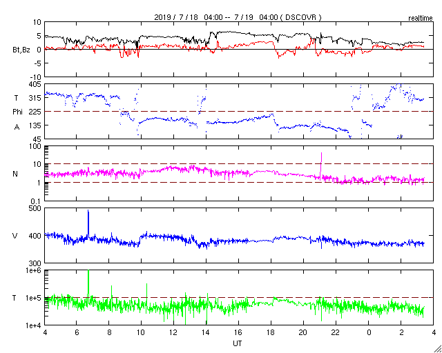 2019/ 7/19 12:31 更新 太陽風はやや低速になっています。磁気圏は穏やかです。 担当 篠原 太陽風の速度は、 昨日のニュースの後に400km/秒台を割り、 370〜380km/秒とやや低速の状態になっています。 磁場強度は、今朝までは5nT前後が続き、 現在は2nTに下がっています。 27日周期の図のセクターのグラフを見ると、 太陽風磁場の大まかな方向の切り替わりが起きています。 磁場強度の弱まりは、 この変化に関係しているのかもしれません。 太陽風磁場の南北成分は、 0nT付近で小さく変化しています。 速度が下がってきたこともあり、磁気圏は穏やかで、 AE指数はほとんど変化の見られない状態です。 SDO衛星AIA193では、 南半球の中緯度から極域にかけてコロナホールが見えています。 緯度が高めなので、地球への影響は小さそうです。 前周期の太陽風は、6月26日に400km/秒に上がった程度でした。 太陽は、無黒点で穏やかです。 ![]() SDO衛星のAIA193カメラによる太陽コロナの様子 (c) SDO (NASA) ![]() SDO衛星による太陽の可視光写真 (c) SDO (NASA) ![]() DSCOVRが観測した太陽風の磁場(1番上の枠、黒線は全体の強度、赤線は南北成分) および、太陽風の密度(3番目の紫線)、速度(4番目の青線) (c) データ:NOAA/SWPC、作図:宇宙天気ニュース ![]() AE指数(速報値) 下段のAEグラフの値が高くなると、オーロラ活動が活発化しています。 (c) 京都大学WDC ![]() ![]() 27日の太陽周期に合わせたデータプロット 太陽が同じ面を地球に向けていた27日前の変化から、今後を予想することができます。 (c) 作図:宇宙天気ニュース