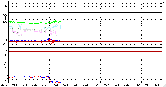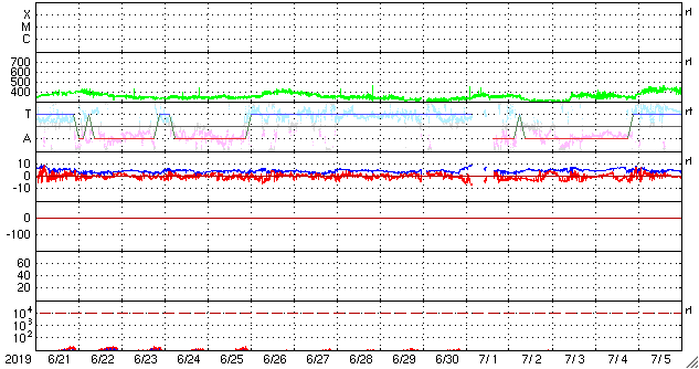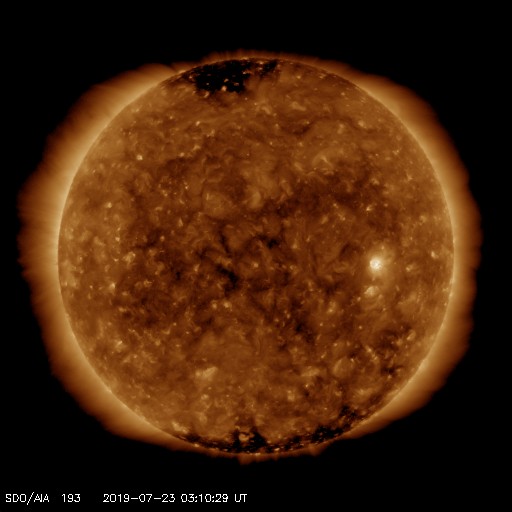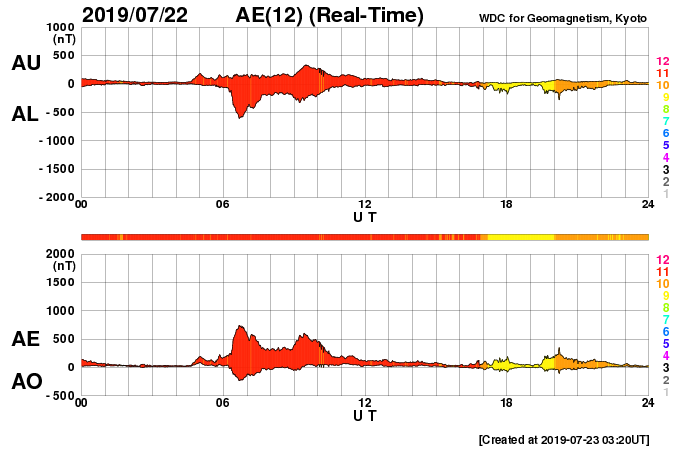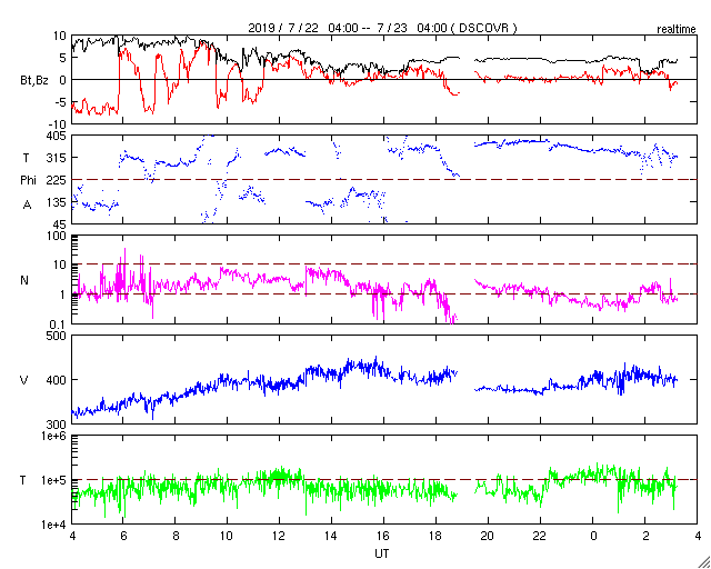 2019/ 7/23 12:25 更新 黒点は見えなくなりました。太陽風は平均的な速度になっています。 担当 篠原 昨日太陽に現れた黒点は、2745群と番号が付けられました。 しかし、SDO衛星の可視光写真によると、 今朝くらいに見えなくなった様です。 SDO衛星AIA193の太陽コロナ写真では、 明るく光っている領域として見えています。 X線グラフに変化はなく、 太陽は穏やかな状態が続いています。 太陽風は、昨日のニュースの後に速度の上昇が始まり、 平均的な速さ程度ですが、深夜に430km/秒に達しました。 その後は少し下げて、400km/秒前後を推移しています。 また、10nT近くに高まっていた磁場強度は、 夜になると下がり始め、 以降は5nT前後と平均的な値になっています。 27日周期の図を見ると、 前周期の6月26日に見られた、 速度の弱い高まりが回帰してきた様です。 前周期は1日程度で高まりは終わったので、 今回も明日には低速風に戻っているかもしれません。 太陽風磁場の南北成分は、 磁場強度が高まっていた頃に、 -5nT程度の南向きの変化が繰り返し発生しています。 このため、AE指数には500〜700nTの中規模の変化が発生しています。 しかし、磁場強度が下がり始めた後は、 南北成分は0nT付近に留まるようになり、 磁気圏も静かになっています。 今日のSDO衛星AIA193では、 赤道や低緯度域にコロナホールは見られません。 今後、太陽風は低速の風が続きそうです。 ![]() SDO衛星のAIA193カメラによる太陽コロナの様子 (c) SDO (NASA) ![]() SDO衛星による太陽の可視光写真 (c) SDO (NASA) ![]() GOES衛星の太陽X線データ (c) NOAA/SWPC ![]() DSCOVRが観測した太陽風の磁場(1番上の枠、黒線は全体の強度、赤線は南北成分) および、太陽風の密度(3番目の紫線)、速度(4番目の青線) (c) データ:NOAA/SWPC、作図:宇宙天気ニュース ![]() AE指数(速報値) 下段のAEグラフの値が高くなると、オーロラ活動が活発化しています。 (c) 京都大学WDC ![]() ![]() 27日の太陽周期に合わせたデータプロット 太陽が同じ面を地球に向けていた27日前の変化から、今後を予想することができます。 (c) 作図:宇宙天気ニュース