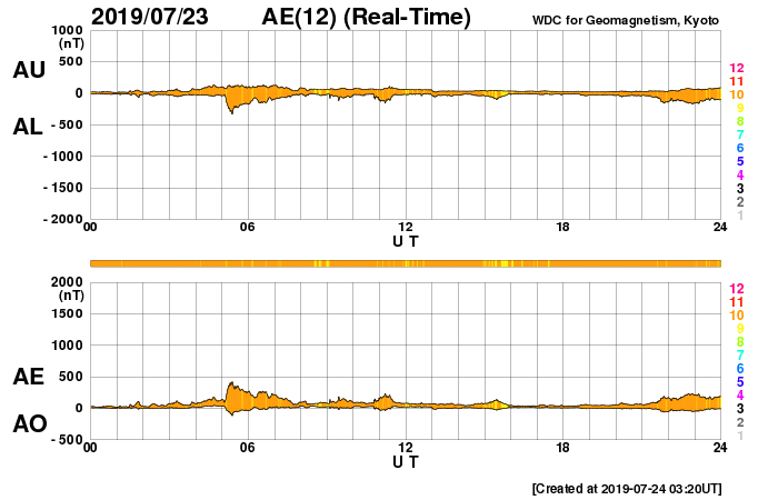 下段のAEグラフの値が高くなると、オーロラ活動が活発化しています。