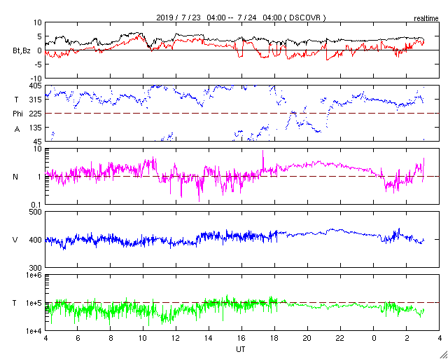 - 2019/ 7/19 12:31 太陽風はやや低速になっています。磁気圏は穏やかです。