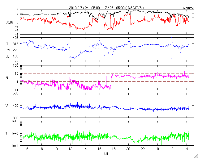 - 2019/ 7/24 12:17 太陽風は平均的な速さです。太陽は無黒点です。