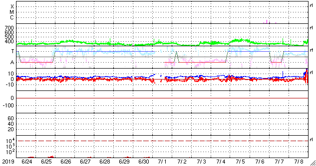 - 2019/ 7/21 09:53 低速の太陽風が続いています。磁気圏も穏やかです。