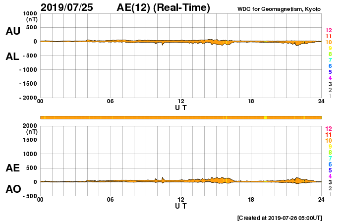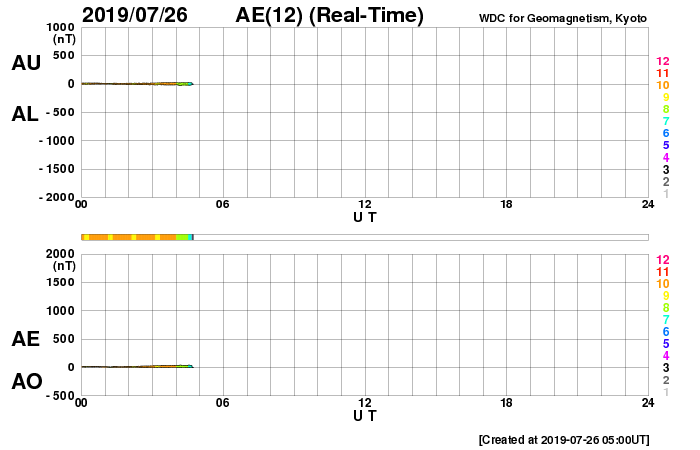 下段のAEグラフの値が高くなると、オーロラ活動が活発化しています。