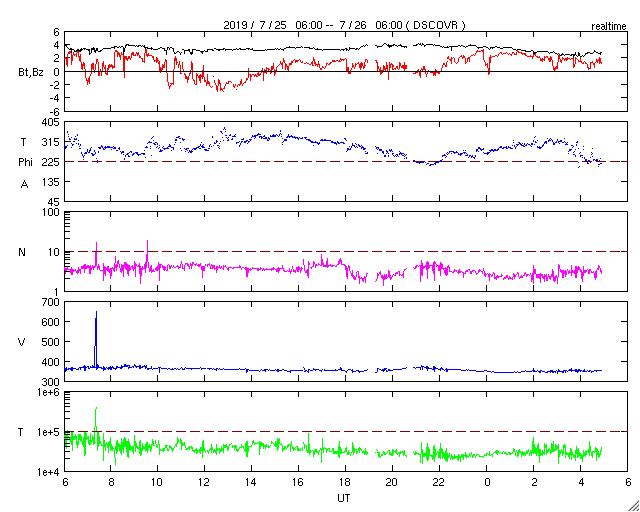 - 2019/ 7/25 13:23 太陽風はやや低速になっています。