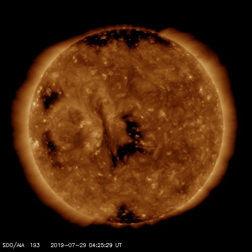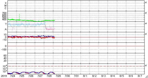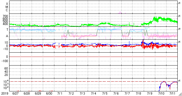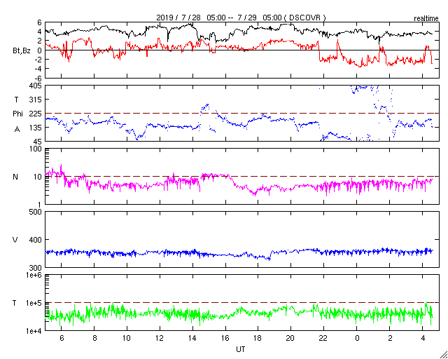 2019/ 7/29 13:43 更新 太陽風は低速で、磁気圏も穏やかです。 担当 篠原 太陽風は、360km/秒と低速の状態で安定しています。 磁場強度は、4nT前後に少し下がりましたが、 こちらも安定した状態です。 磁場の南北成分は、 グラフの中盤までは0nT付近ですが、 後半になると弱い南寄りになっています。 しかし、振幅は小さいことや、速度が下がっているため、 磁気圏は穏やかな状態が続いていて、 AE指数は特に変化は見られません。 SDO衛星SIS193では、 コロナホールが太陽の中央に見えています。 3日後の太陽風に影響が見られそうです。 コロナホールは27日前より広がっています。 27日周期の図の前周期よりも、 太陽風の変化は強まるかもしれません。 太陽は、無黒点で穏やかな状態が続いています。 ![]() SDO衛星のAIA193カメラによる太陽コロナの様子 (c) SDO (NASA) ![]() SDO衛星による太陽の可視光写真 (c) SDO (NASA) ![]() DSCOVRが観測した太陽風の磁場(1番上の枠、黒線は全体の強度、赤線は南北成分) および、太陽風の密度(3番目の紫線)、速度(4番目の青線) (c) データ:NOAA/SWPC、作図:宇宙天気ニュース ![]() AE指数(速報値) 下段のAEグラフの値が高くなると、オーロラ活動が活発化しています。 (c) 京都大学WDC ![]() ![]() 27日の太陽周期に合わせたデータプロット 太陽が同じ面を地球に向けていた27日前の変化から、今後を予想することができます。 (c) 作図:宇宙天気ニュース