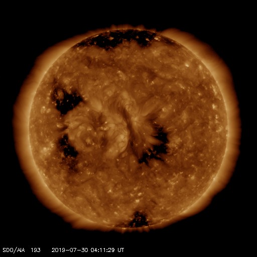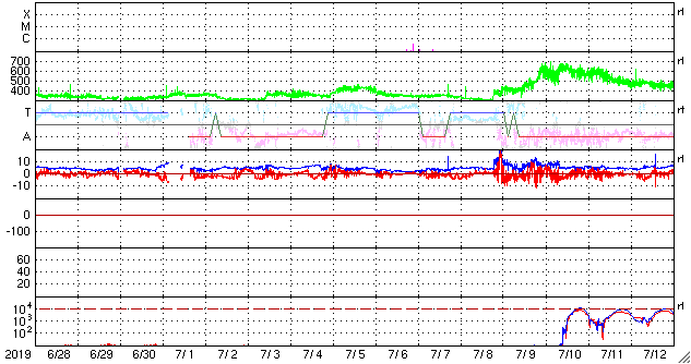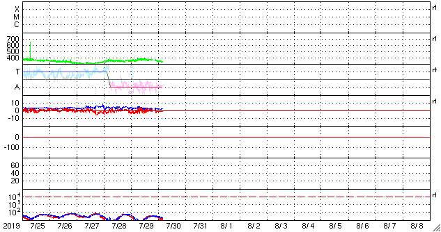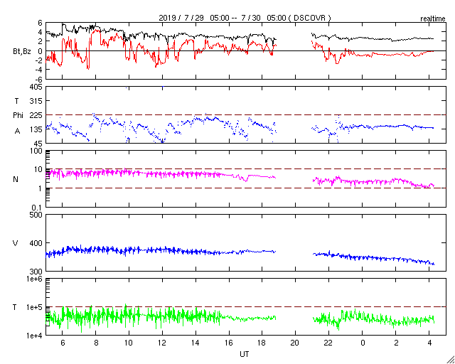 2019/ 7/30 13:24 更新 太陽風は低速の風が続いています。太陽は無黒点です。 担当 篠原 太陽風の速度は、 昨日のニュースの後に380km/秒まで高まりましたが、 夜になると低下を始めて、現在は330km/秒まで下がっています。 変化としては小さく、低速の状態が続いています。 磁場強度は、2〜3nTと弱くなっています。 磁気圏は静穏で、 AE指数は、昨日の午後に500nTの変化が起きた程度で、 以降は静かに推移しています。 SDO衛生AIA193では、 太陽の中央部のコロナホールが西半球側に進んでいます。 また、東側(左側)には、 次のコロナホールが南北に大きく広がっています。 この領域は、27日周期の図の前周期の 7月9日以降の太陽風の高まりをもたらしたと思われます。 広がりが増しているので、8月5日以降の変化に注目してください。 太陽は、無黒点が続いています。