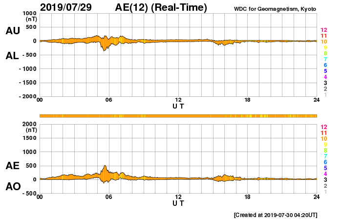 (c) SDO (NASA) ![]() SDO衛星による太陽の可視光写真 (c) SDO (NASA) ![]() DSCOVRが観測した太陽風の磁場(1番上の枠、黒線は全体の強度、赤線は南北成分) および、太陽風の密度(3番目の紫線)、速度(4番目の青線) (c) データ:NOAA/SWPC、作図:宇宙天気ニュース ![]() AE指数(速報値) 下段のAEグラフの値が高くなると、オーロラ活動が活発化しています。 (c) 京都大学WDC ![]() ![]() 27日の太陽周期に合わせたデータプロット 太陽が同じ面を地球に向けていた27日前の変化から、今後を予想することができます。 (c) 作図:宇宙天気ニュース