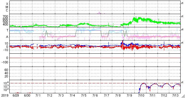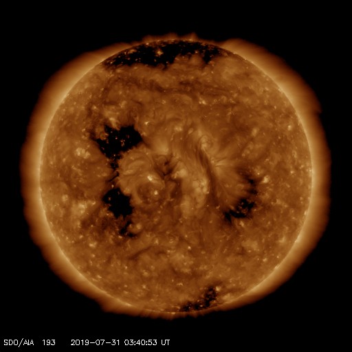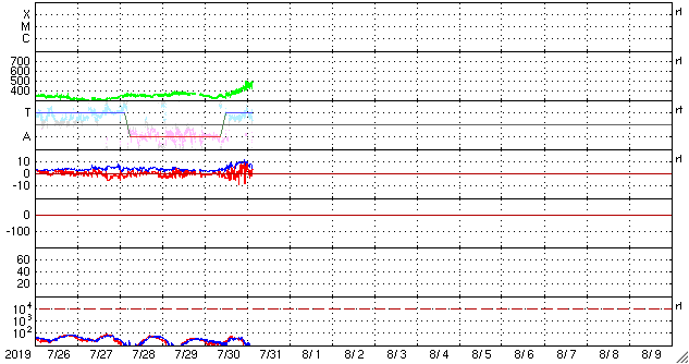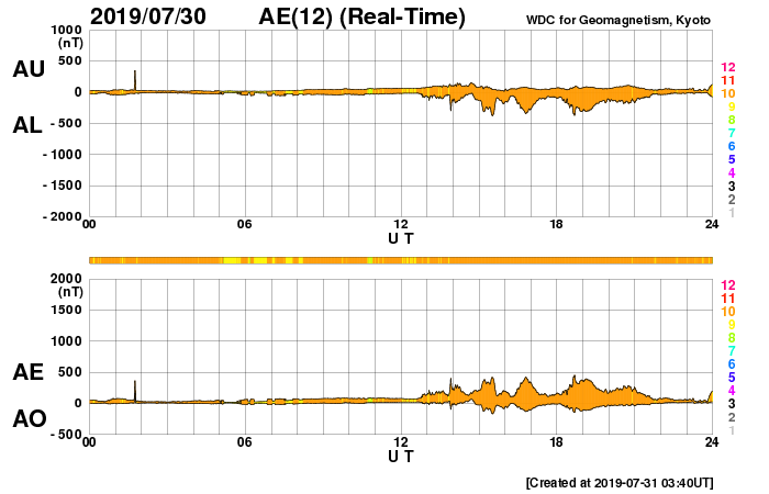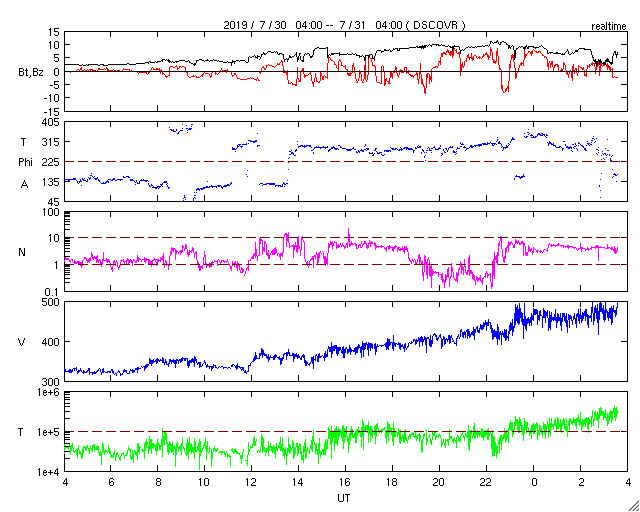 2019/ 7/31 12:49 更新 太陽風の速度がやや高まっています。 担当 篠原 昨夜から、太陽風の速度と磁場強度が高まり、 速度は470km/秒とやや高速になり、 磁場強度も一時的に10nTまで高まりました。 磁場は、現在は3nTへ下がっています。 SDO衛星AIA193に見えていたコロナホールの影響としては、 まだ早い印象です。 むしろ、これからコロナホールの影響で、 太陽風が一段と高まっていく可能性があります。 磁気圏の活動は、やや高まっている程度です。 AE指数は、後半から400nTの小規模の活動が 繰り返し発生する様になっています。 現在は磁場強度が下がってしまったので、 磁気圏の活動は弱まっていきそうです。 SDO衛星AIA193では、 コロナホールが西半球の半分近くまで進んでいます。 引き続き、こちらの影響に注目してください。 太陽は今日も無黒点です。 静かな状態が続いています。 7月の無黒点日は、29日に達しそうです。