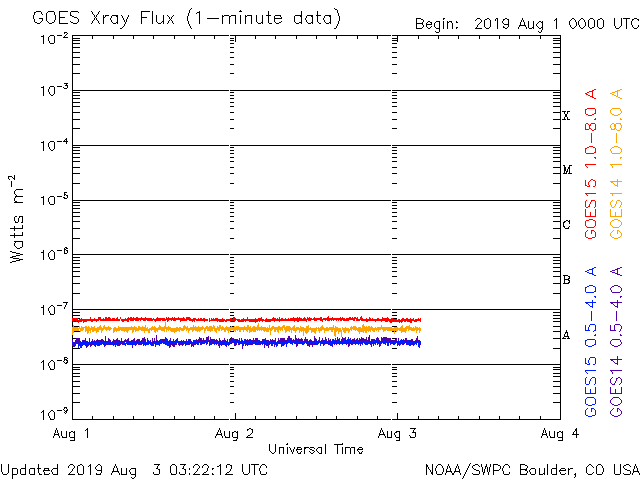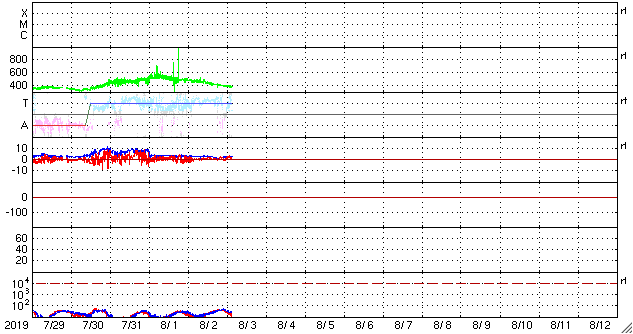 - 2019/ 8/ 2 12:29 太陽風の速度は少し下がっています。7月の黒点数は 0.9 でした。