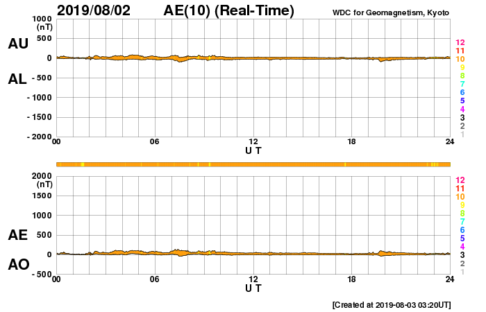 下段のAEグラフの値が高くなると、オーロラ活動が活発化しています。