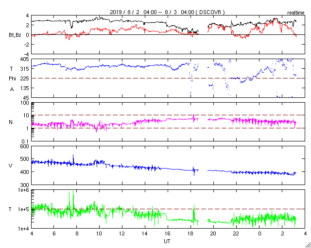 - 2019/ 7/31 12:49 太陽風の速度がやや高まっています。