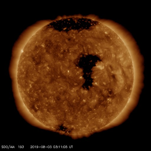 - 2019/ 8/ 1 12:29 太陽風は520km/秒に高まり、高速風になっています。