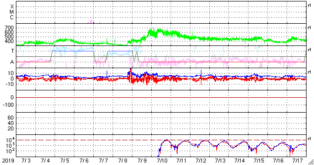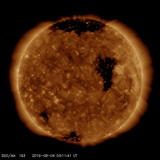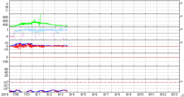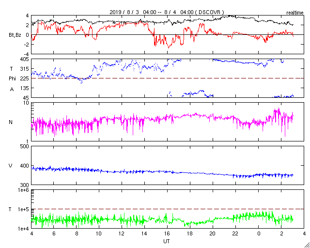 2019/ 8/ 4 12:17 更新 太陽風は低速です。コロナホールの影響が始まりそうです。 担当 篠原 太陽風の速度は更に下がり、350km/秒と低速の状態です。 磁場強度は、3nT前後でやや弱い状態です。 磁場の南北成分は、 北寄りの傾向から、0nT付近になっています。 途中、南寄りになる時間帯もありますが、振れ幅は小さく、 磁気圏は穏やかな状態が続いています。 AE指数は、ほとんど変化が見られない状態です。 SDO衛星AIA193では、コロナホールが西側に更に進み、 地球へ影響が及び始める目安の位置に近付いています。 27日周期の図では、 前周期の太陽風は7月8日の終わり(世界時)から 変化が始まっています。 このままであれば、明日の早い時間に始まりそうです。 今回はどのタイミングになるでしょうか。 太陽は、無黒点で穏やかな状態が続いています。