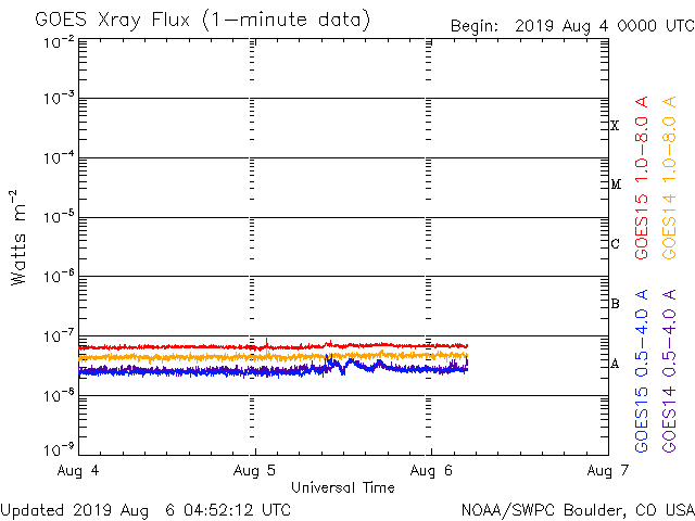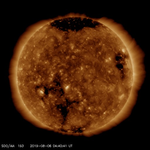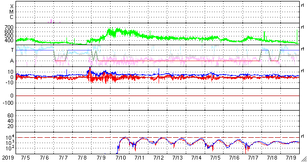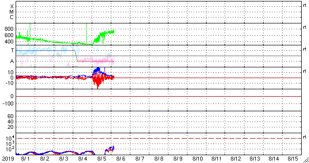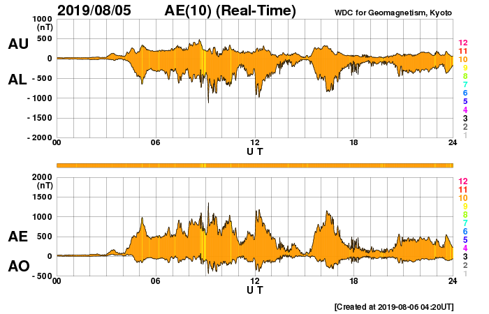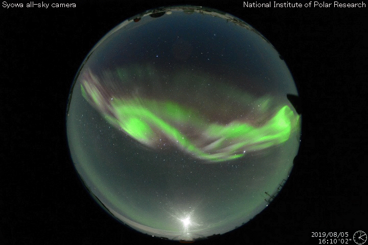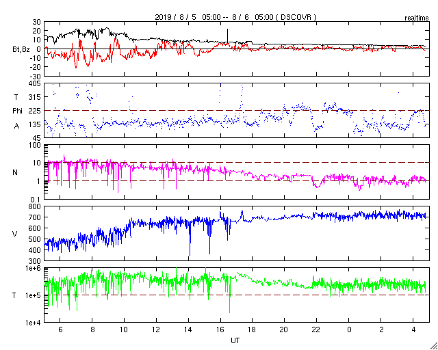 2019/ 8/ 6 14:00 更新 太陽風の速度は700km/秒に高まり、磁気圏も活動的になっています。 担当 篠原 太陽風の速度は、 昨日の夕方に500km/秒を超えて高速状態になり、 その後も上昇を続けて、今朝早くに700km/秒に達しました。 27日周期の図を見ると、前周期を上回る高速風になっています。 太陽風の磁場強度は、昨夕に20nTまで高まりましたが、 その後は次第に低下して、現在は3nTとやや弱い状態です。 磁場の南北成分は、磁場が強まっていた昨夜までは、 南向きのやや大きい変化が続いていました。 このため、磁気圏の活動も高まって、 AE指数は1000nTを超える大規模な変化が繰り返し発生しています。 その最後の大きな高まりである、世界時5日16時頃のオーロラの様子を、 昭和基地の全天カメラの動画で紹介します。 磁場強度が下がり始めた後は、南北の振れ方も小さくなっています。 磁気圏の活動度は一段下がって、 AE指数は500nT前後の中規模の変化が続く程度になっています。 前周期の太陽風は、 500km/秒を超える速度の高まりが2日ほど続いて、 その後、400km/秒台中盤の状態が4日ほど続きました。 今回はどの様な推移になるでしょうか。 太陽では、昨日の午後から今朝にかけて、 中央部の南半球側に黒点が出現していました。 SDO衛星AIA193の写真の 中央の少し下で明るく光っている場所です。 2745群と番号が付けられましたが、 現在はほぼ見えなくなっています。 放射線帯の高エネルギー電子は、 太陽風の高まりを受けて、今後高まって行く可能性があります。 現在はまだ低い状態です。