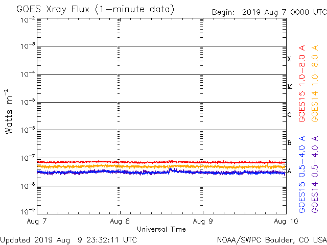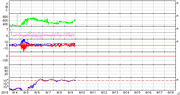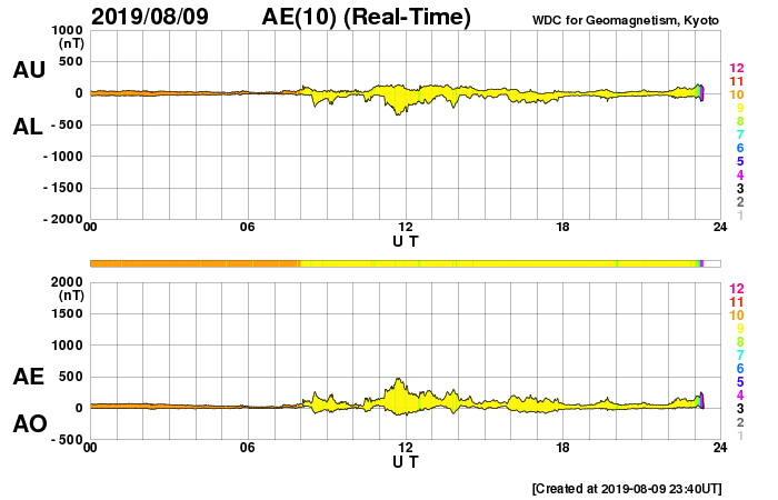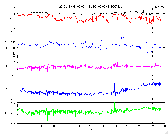 2019/ 8/10 08:38 更新 太陽風の速度は630km/秒に高まっています。 担当 篠原 太陽風の速度は、昨日の午後以降は 480km/秒とやや高速の状態になっていましたが、 今日の未明になると再び上昇を始め、 現在、630km/秒に高まっています。 27日周期の図の前周期のやや高速の風とは違い、 しっかりと高速風の領域になっています。 一昨日のニュースで紹介した、 太陽の南側のコロナホールの影響がやって来たのでしょうか。 太陽風の磁場強度は、5nT前後の平均的な状態が続いています。 南北成分は、グラフの後半から南北に振れる様になっています。 このためAE指数のグラフも、 後半から小さい変化が見られる様に変わっています。 速度がだいぶ高まっているので、磁場の南向きの変化が続けば、 磁気圏の活動ももう一段高まりそうです。 太陽は無黒点です。 X線グラフに変化は見られません。 放射線帯の高エネルギー電子は、 1万を超えて高まった状態が続いています。
