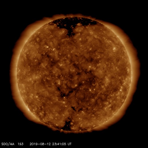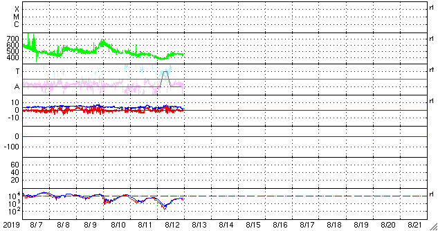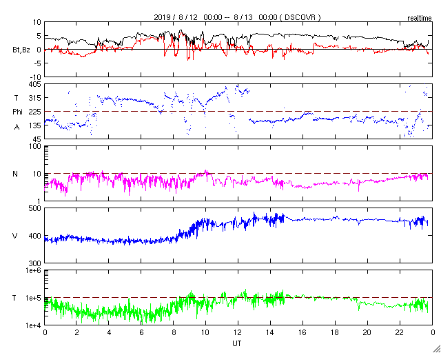 2019/ 8/13 08:58 更新 太陽風はやや高速になっています。磁気圏は穏やかです。 担当 篠原 太陽風の速度は、昨夜、12日19時(世界時12日10時)頃から 450km/秒とやや高速の風になっています。 太陽風は、上がったり下がったりの変化が続いています。 太陽風の磁場強度は、 今朝まで5nT前後の状態でしたが、 現在は2nT程度と弱くなっています。 太陽風磁場の大まかな方向の切り替わりが近いのかもしれません。 磁場の南北成分は、0nT付近で変化しています。 磁気圏は静穏で、AE指数は特に変化がありません。 太陽風速度の高まりは、一時的な変化だと思われます。 次第に穏やかな状態に戻っていくでしょう。 太陽は無黒点で、穏やかな状態が続いています。 ![]() SDO衛星のAIA193カメラによる太陽コロナの様子 (c) SDO (NASA) ![]() SDO衛星による太陽の可視光写真 (c) SDO (NASA) ![]() DSCOVRが観測した太陽風の磁場(1番上の枠、黒線は全体の強度、赤線は南北成分) および、太陽風の密度(3番目の紫線)、速度(4番目の青線) (c) データ:NOAA/SWPC、作図:宇宙天気ニュース ![]() AE指数(速報値) 下段のAEグラフの値が高くなると、オーロラ活動が活発化しています。 (c) 京都大学WDC ![]() 27日の太陽周期に合わせたデータプロット 太陽が同じ面を地球に向けていた27日前の変化から、今後を予想することができます。 (c) 作図:宇宙天気ニュース