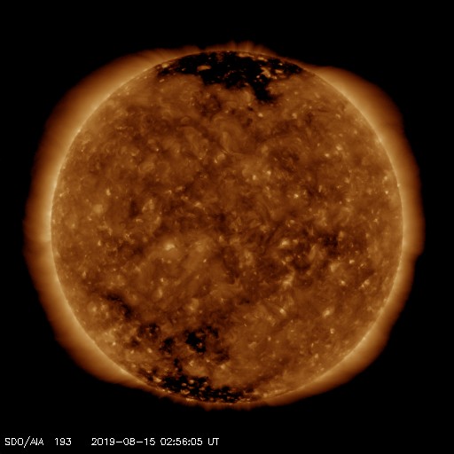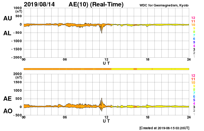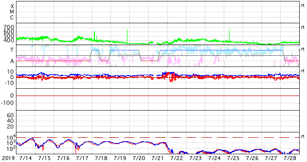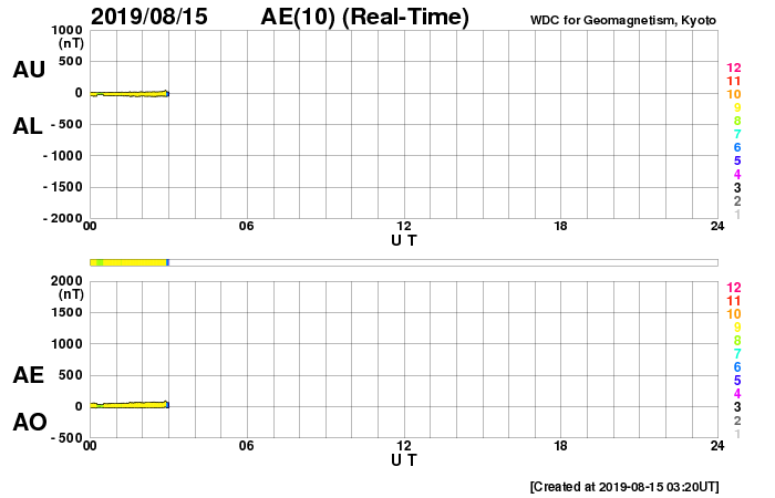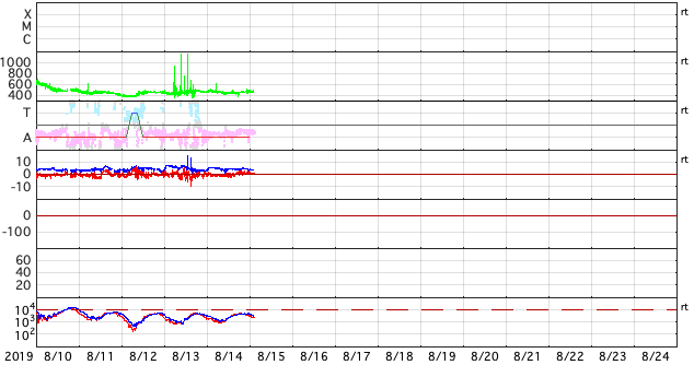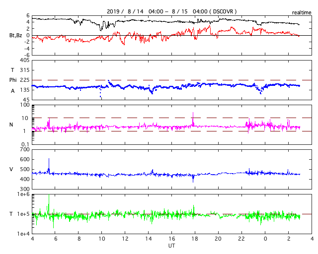 2019/ 8/15 12:12 更新 やや高速の太陽風が続いています。磁気圏は穏やかです。 担当 篠原 太陽風の速度は、450km/秒の状態が続いています。 掲載の27日周期の図では、始まりは既に見えなくなっていますが、 8月8日以降、やや高まった速度の太陽風が続いています。 磁場強度は、4〜5nTと平均的な状態です。 南北成分は、グラフの前半は弱い南寄りで、 後半から弱い北寄りに変わっています。 変化は小さいため、磁気圏は穏やかで、 AE指数は、グラフの前半に小さい変化が見られる程度です。 SDO衛星AIA193では、 太陽の低緯度域にコロナホールはなく、 今後も太陽風は穏やかに推移しそうです。 太陽は無黒点が続いています。 X線グラフも変化はありません。 台風10号は、私の地域では特に影響なく通り過ぎて行きました。 今日の午後にネットワークが回復する予定ですので、 明日からは通常運転に戻ります。