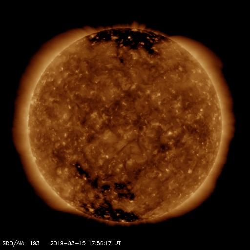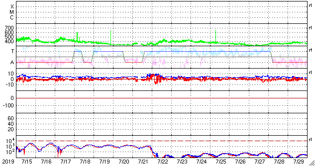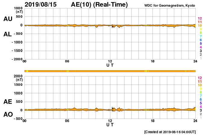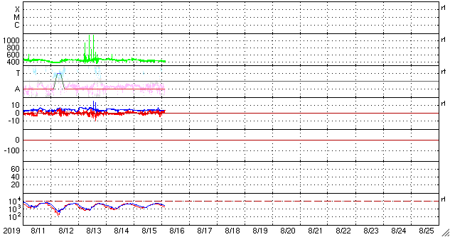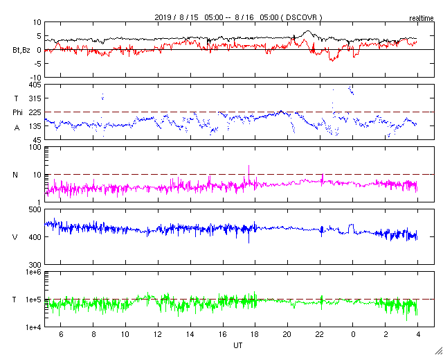 2019/ 8/16 13:02 更新 太陽風は平均的な状態です。磁気圏も穏やかに推移しています。 担当 篠原 太陽風の速度は、 450km/秒から400km/秒へゆっくりと下がっています。 磁場強度は4nT前後で安定していて、 太陽風は平均的な状態です。 磁場の南北成分は、 0nT付近か、弱い北寄りの傾向です。 磁気圏は穏やかで、AE指数のグラフは特に変化は見られません。 SDO衛星AIA193では、 南半球の高緯度寄りにコロナホールが見えています。 緯度が高いので、地球への影響は小さいと思われます。 27日周期の図を見ると、前周期の太陽風の速度は、 7月22日に300km/秒台から400km/秒へ少し高まった程度です。 全体としては、穏やかな状態が続きそうです。 太陽は、SDO衛星の画像が今日未明までで止まっていますが、 その時点では黒点はありません。 X線グラフも変化のない状態です。