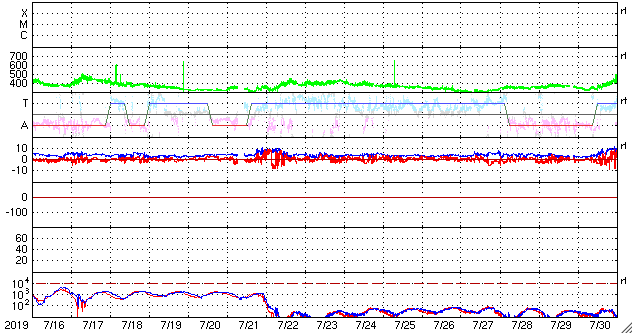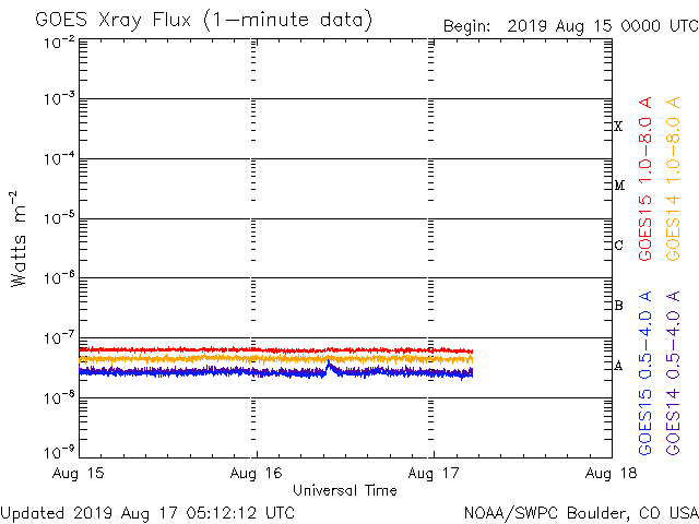 - 2019/ 8/15 12:12 やや高速の太陽風が続いています。磁気圏は穏やかです。