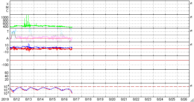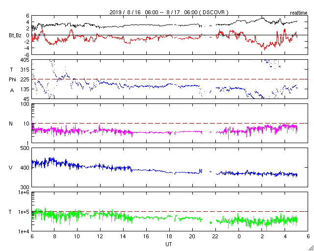 - 2019/ 8/16 13:02 太陽風は平均的な状態です。磁気圏も穏やかに推移しています。