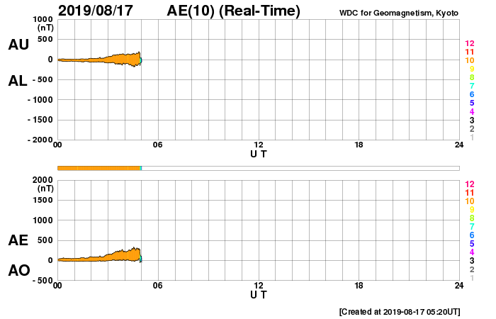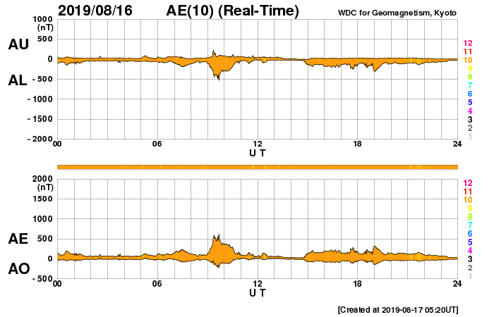 下段のAEグラフの値が高くなると、オーロラ活動が活発化しています。
