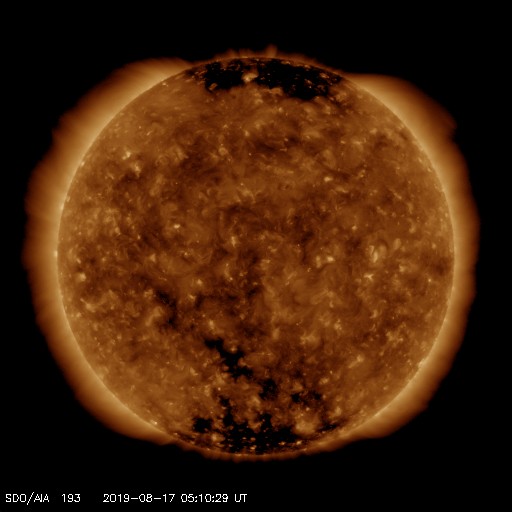 - 2019/ 8/12 09:54 高速の太陽風は終わって、やや低速の風に変わっています。