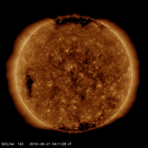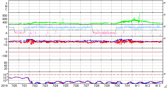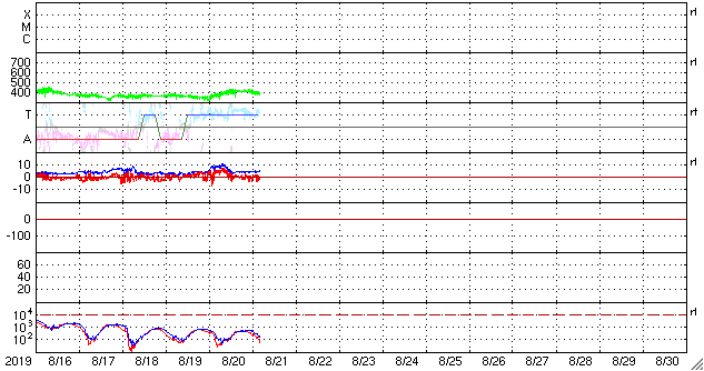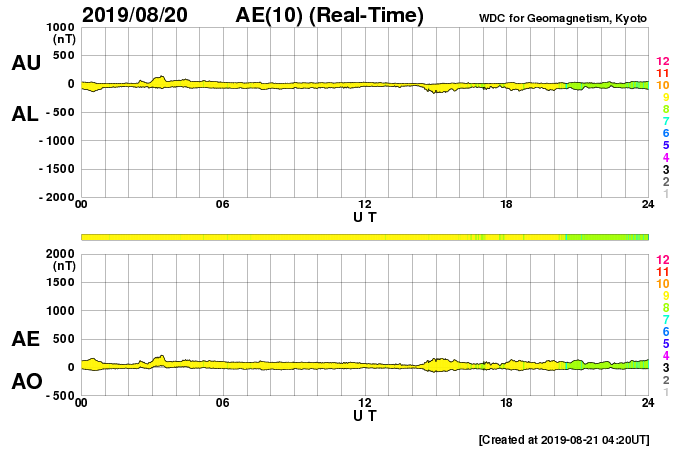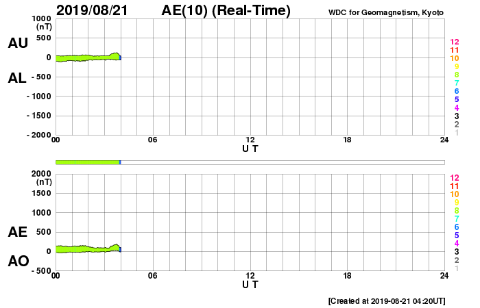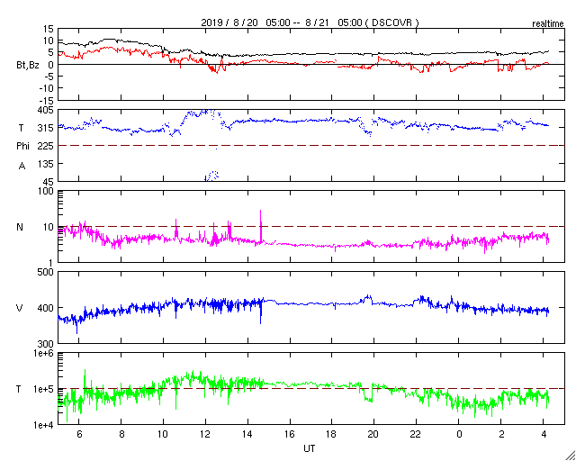 2019/ 8/21 13:22 更新 太陽風は平均的な状態です。磁気圏は穏やかです。 担当 篠原 太陽風は、昨夜に400km/秒と平均的な速さに高まり、 現在までこの状態が続いています。 磁場強度は、昨日のニュースの後に10nTまで高まって、 その後、5nTと平均的な値に下がっています。 27日周期の図の前周期と同じ様に、 400km/秒の状態で落ち着いています。 磁場の南北成分は、磁場が強まっていた頃は北寄りで、 以降は0nT付近と小さくなっています。 磁気圏は穏やかで、AE指数は特に変化のない状態です。 SDO衛星AIA193では、太陽の中央部にコロナホールはなく、 太陽風は再び低速風に変わっていきそうです。 一方、東端(左端)近くの南半球側にコロナホールが見えています。 前周期の7月31日に始まっている太陽風速度の高まりは、 この領域によるものです。 今回は8月27日頃でしょうか。 太陽は、無黒点の状態が続いています。