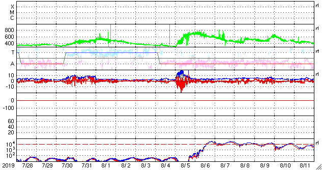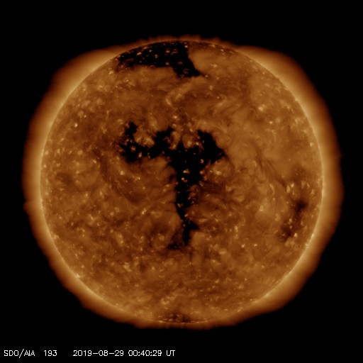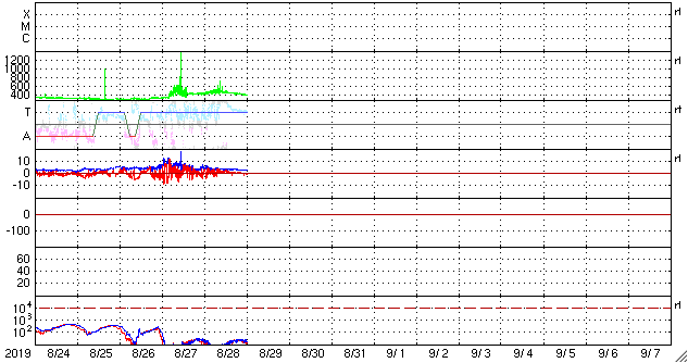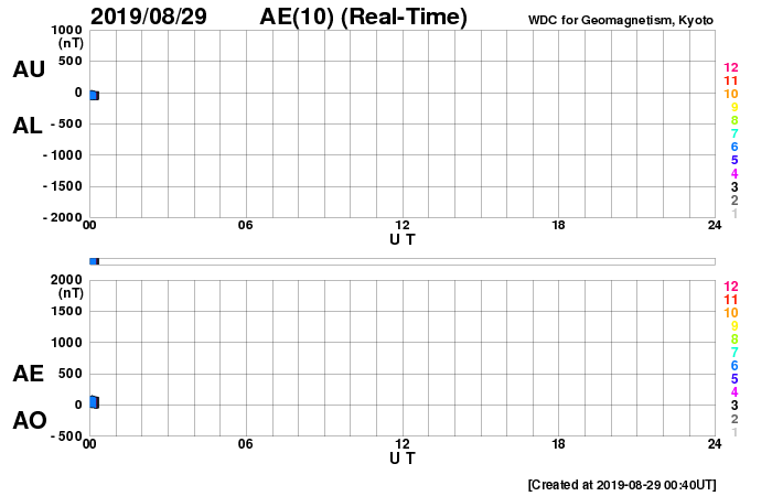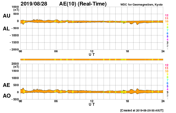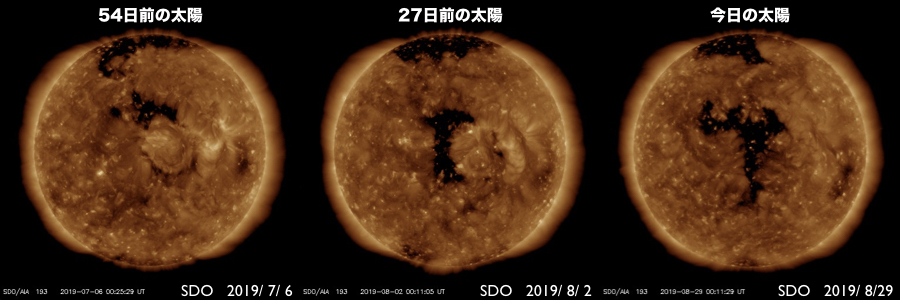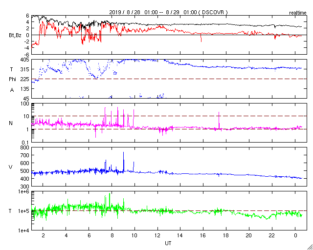 2019/ 8/29 09:47 更新 太陽風速度の高まりは終わり、平均的な状態です。 担当 篠原 太陽風の速度は、昨日の午後にかけて500km/秒に上がり、 その後低下を始めて、現在は410km/秒と平均的な速さに戻っています。 磁場強度は、3nTとやや弱い状態が続いています。 磁場の南北成分は、グラフの前半は弱い北寄りでしたが、 その後は、0nT付近で小さく変化する様になっています。 磁気圏は穏やかで、AE指数は特に変化は見られません。 コロナホールによる太陽風の高まりは、一段落ついた様です。 一方、次のコロナホールが太陽の中心に広がっています。 前の周期と比較すると(1枚目の図)、 コロナホールの広がりは前周期よりも増しています。 27日周期の図では、 前周期の太陽風は8月5日から速度の上昇が始まって、 700km/秒を超えるくらいに高まり、高速風は6日ほど続いています。 今回の太陽風は、より大きな高まりになるかもしれません。 到来は2〜3日後くらいになりそうです。 太陽は無黒点で、穏やかな状態が続いています。