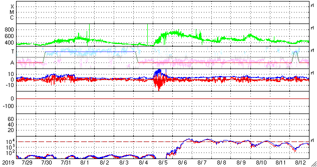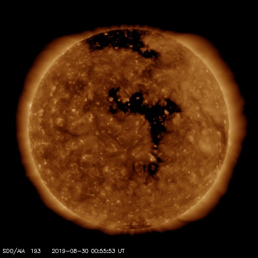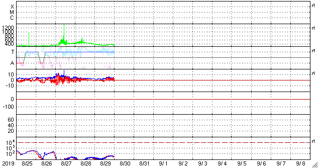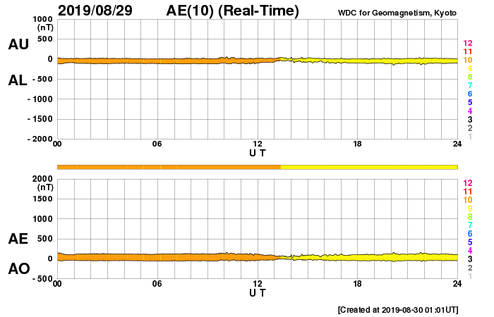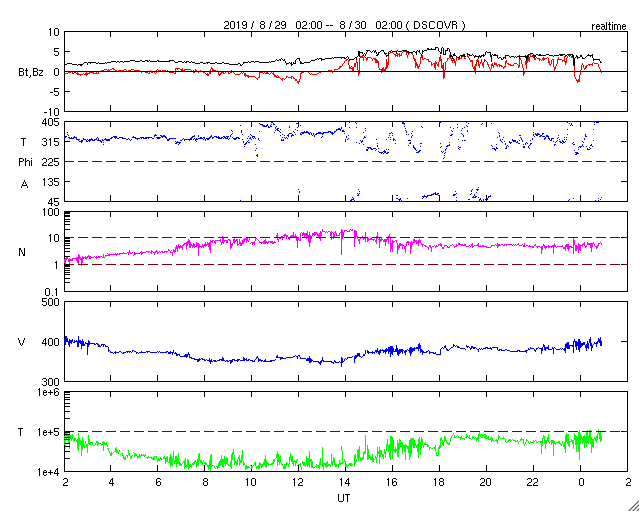 2019/ 8/30 10:06 更新 太陽風は平均的な状態です。今後コロナホールの影響が始まりそうです。 担当 篠原 太陽風の速度は、400km/秒から350km/秒へ下がり、 再び400km/秒へ戻っています。 現在は平均的な速さです。 2nTに下がっていた磁場強度は、 4〜5nTと平均的な値に戻っています。 南北成分は、グラフの前半は0nT付近でしたが、 後半は北寄りになっています。 磁気圏は穏やかで、AE指数はほとんど変化のない状態です。 SDO衛星AIA193では、 太陽中央部のコロナホールは西に進み、 先頭(右端)は、西半球の真ん中近くに達しています。 明日くらいから太陽風の変化が始まりそうです。 磁場の強まりが始まって、南向きに大きく変化すると、 磁気圏の活動も高まります。 今後のオーロラの活動の高まりにも注目してください。 太陽は、無黒点で穏やかな状態が続いています。 SILSOの速報値では、8月8日以降無黒点の日が続いています。 8月の黒点相対数もかなり低い値になりそうです。 新居浜で高専スペースキャンプに参加しています。 参加しているおよそ30名高専生たちは、 昨夜から超小型衛星のモデル機の製作に取り組んでいます。 ただ、今朝から雨になっていて、 午後に予定されている屋外実験ができるかどうか心配です。