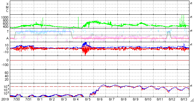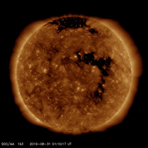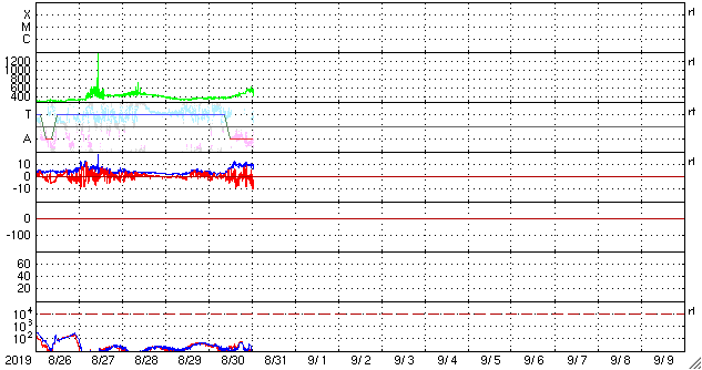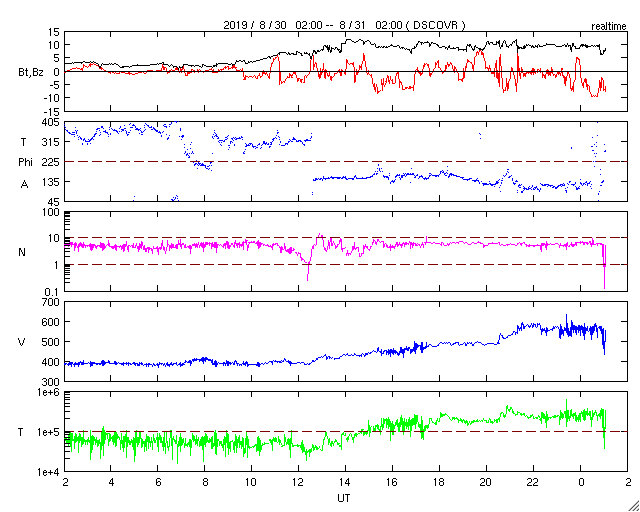 2019/ 8/31 10:19 更新 高速太陽風が到来し、速度は570km/秒に高まっています。 担当 篠原 コロナホールの影響が到来して、高速太陽風が始まっています。 変化は、昨夜、磁場強度の高まりから始まりました。 2nTと弱くなっていた磁場強度は、 30日23時(世界時30日14時)頃に10nTに強まります。 その頃から速度も上昇し始めて、 今朝、31日6時(世界時30日21時)頃に、570km/秒に達しました。 現在もこの高速風が続いています。 27日周期の図を見ると、 速度の変化は前周期よりも1日ほど早くなっています。 コロナホールが広がったことが影響している様です。 太陽風磁場の南北成分は、時々南向きに強まっています。 そのタイミングで磁気圏の活動も高まっていて、 AE指数のグラフでは、 500〜700nTの中規模の高まりが発生しています。 太陽風の磁場強度は高まった状態が続いているので、 速度は更に高まる可能性があります。 前周期は700km/秒を超えるくらいに高まりました。 この後の速度の変化に注目して下さい。 また、磁場が強まっていることから、 南向きの大きな変化が到来する可能性があります (掲載のグラフでも、最後は -10nTの変化になっています)。 速度が高まっていることもあり、 磁気圏の活動は更に大きな変化になる可能性があります。 太陽は、無黒点です。 穏やかに推移しています。 高専スペースキャンプは3日目を迎えています。 昨日の午後は曇り空ですみ、無事に屋外実験を行うことができました。 今日も、天気予報は厳しいのですが、今のところ天気は良く、 このまま今日も屋外実験に進みたいところです。