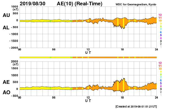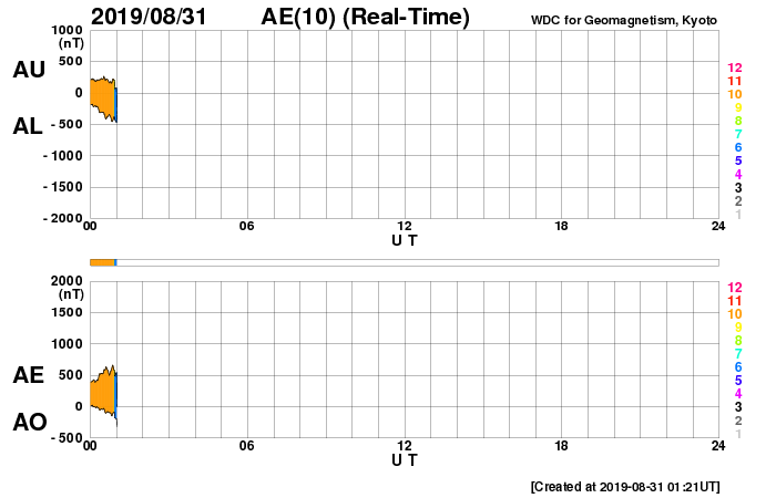 (c) SDO (NASA) ![]() SDO衛星による太陽の可視光写真 (c) SDO (NASA) ![]() DSCOVRが観測した太陽風の磁場(1番上の枠、黒線は全体の強度、赤線は南北成分) および、太陽風の密度(3番目の紫線)、速度(4番目の青線) (c) データ:NOAA/SWPC、作図:宇宙天気ニュース ![]() AE指数(速報値) 下段のAEグラフの値が高くなると、オーロラ活動が活発化しています。 (c) 京都大学WDC ![]() ![]() 27日の太陽周期に合わせたデータプロット 太陽が同じ面を地球に向けていた27日前の変化から、今後を予想することができます。 (c) 作図:宇宙天気ニュース