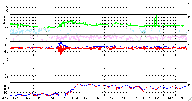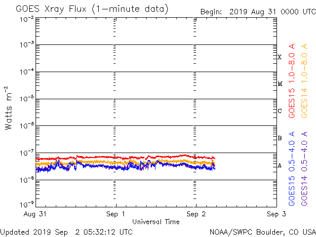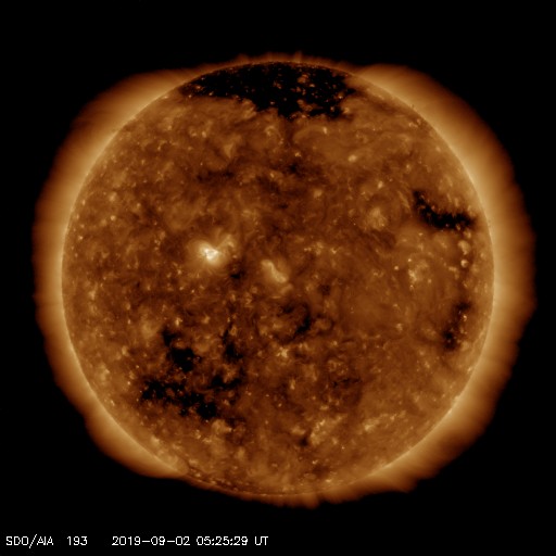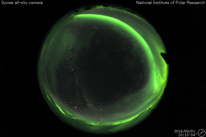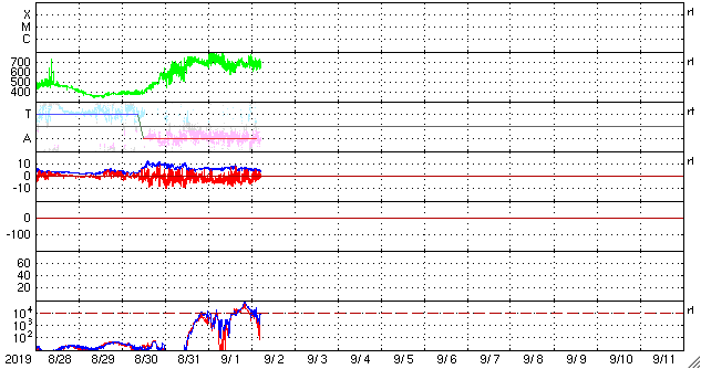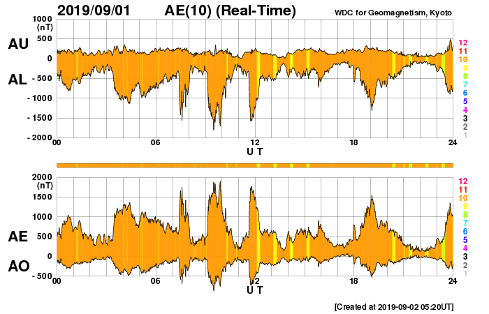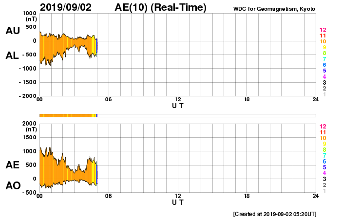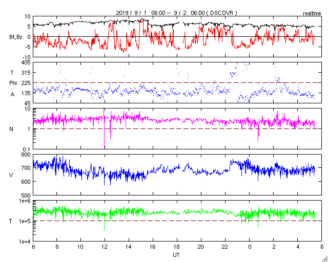 2019/ 9/ 2 14:34 更新 700km/秒程度の高速太陽風が続き、磁気圏の活動も高まっています。 担当 篠原 高速の太陽風が続いています。 昨日の750km/秒からは少し下がりましたが、 650〜700km/秒と高い速度を保っています。 磁場強度は、6nTから5nTに少し下がった程度で、 平均的な値を保っています。 太陽風磁場の南北成分は、 グラフの初めから中盤にかけて、 -5nT程度の南向きの変化が頻繁に発生しています。 速度が高まっていることも重なり、 磁気圏の活動はかなり活発になっています。 AE指数のグラフでは、 1000nTを超える大規模な変化が何度も発生し、 最大の変化は1800nTに達しています。 AE指数のグラフで特に大きく変化している時間ではありませんが、 世界時1日20時過ぎの昭和基地のオーロラの動画を掲載します。 空全体に渦を巻く様な見事なオーロラが撮影されています。 太陽風のグラフでは、終わり頃の磁場の南北成分は、 南向きの変化が小さくなっています。 これに合わせる様に、 AE指数の変化も最後は700nT程度になっています。 このまま磁場の南向きの変化が小さくなる様であれば、 磁気圏の変化も小さくなっていくでしょう。 SDO衛星AIA193では、 今回の高速太陽風をもたらしたコロナホールは、 太陽の西の端まで進んでいます。 この後は、太陽風の高まりも次第に弱まって行くでしょう。 太陽は、昨日現れた黒点に2748群と番号が付けられています。 X線グラフは、とても小さい変化が見えている程度で穏やかです。 放射線帯の高エネルギー電子は、1万を超えて高まっています。 明日は更に高まるでしょうか。 ![]() 南極・昭和基地の全天カメラで、世界時1日20時過ぎに撮影されたオーロラ。 (c) 国立極地研究所、(動画加工 : 宇宙天気ニュース) ![]() SDO衛星のAIA193カメラによる太陽コロナの様子 (c) SDO (NASA) ![]() SDO衛星による太陽の可視光写真。マウスの矢印を写真に重ねると、黒点番号付きの写真に切り替わります。 (c) SDO (NASA) ![]() DSCOVRが観測した太陽風の磁場(1番上の枠、黒線は全体の強度、赤線は南北成分) および、太陽風の密度(3番目の紫線)、速度(4番目の青線) (c) データ:NOAA/SWPC、作図:宇宙天気ニュース ![]() AE指数(速報値) 下段のAEグラフの値が高くなると、オーロラ活動が活発化しています。 (c) 京都大学WDC ![]() ![]() 27日の太陽周期に合わせたデータプロット 太陽が同じ面を地球に向けていた27日前の変化から、今後を予想することができます。 (c) 作図:宇宙天気ニュース