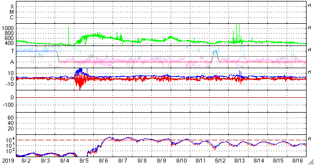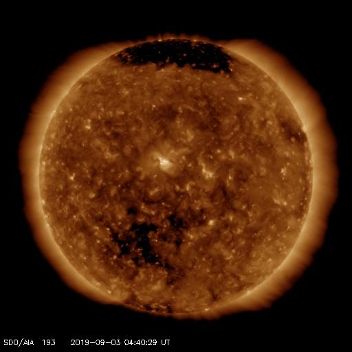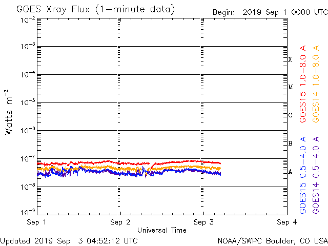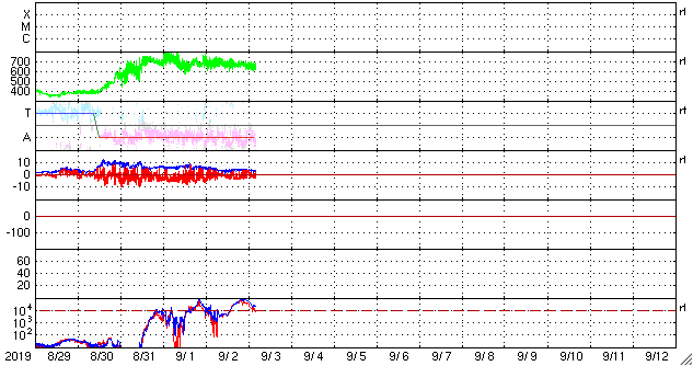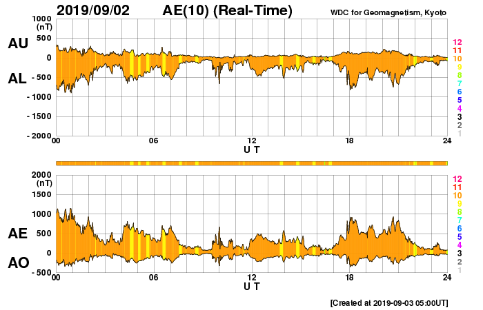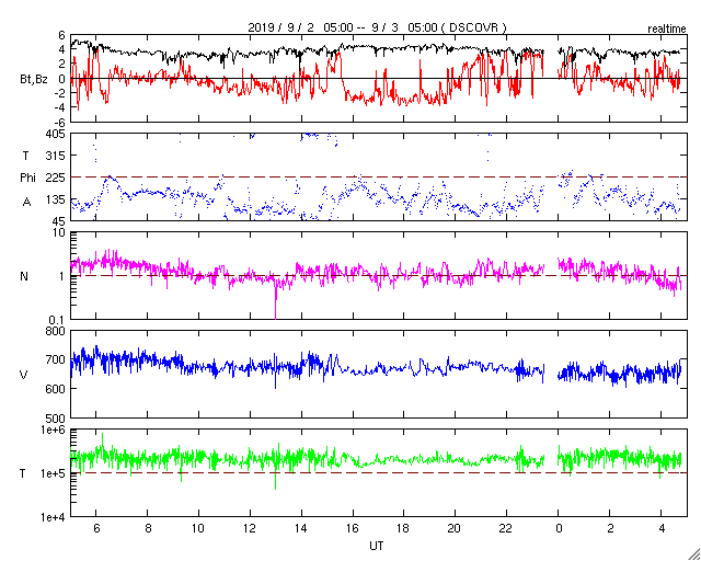 2019/ 9/ 3 13:58 更新 高速太陽風は、650km/秒に少し下がっています。イエローナイフのオーロラをどうぞ。 担当 篠原 田代敦志さんより、カナダ・イエローナイフで、 現地8月30日23時(世界時31日5時)に撮影された オーロラの写真をいただきました。 今回の高速太陽風が始まって半日後くらいの、 速度が600k/秒台に達した頃のオーロラです。 AE指数は、この直後に1000nTに達する変化を記録しています。 美しいオーロラの帯が頭上を通り抜けています。 田代さんによると、この後オーロラが全天に広がって、 辺りが明るくなる程の輝きになったそうです。 秋分の日も近付き、 北半球のオーロラの季節が始まったんだなと感じます。 美しい写真をどうもありがとうございます。 太陽風は、高い速度を保っています。 昨日のニュースの後、再び700km/秒に高まり、 そこからゆっくりと低下して、現在は650km/秒です。 磁場強度は、3〜4nTとやや弱くなっています。 高速風としては、後半に入りつつある様です。 太陽風磁場の南北成分は、磁場が弱まってきたこともあり、 南向きの変化は、-2〜 -3nTと小さくなってきました。 このため、磁気圏の活動も規模が一段小さくなり、 AE指数の変化は500〜800nTと中規模に留まっています。 27日周期の図を見ると、 前周期の太陽風は8月10日にかけて500km/秒前後を推移しています。 今回も同様であれば、今後次第に速度を下げながら、 3〜4日程度速度の高まった状態が続きそうです。 磁気圏の活動の規模も、次第に小さくなっていくでしょう。 太陽の2748黒点群は小さくなっています。 掲載の写真ではかろうじて見える程度です。 太陽は無黒点に戻りそうです。 放射線帯の高エネルギー電子は、10万近くまで高まっています。 高速風が落ち着いてきたので、今後は減少に向かいそうです。