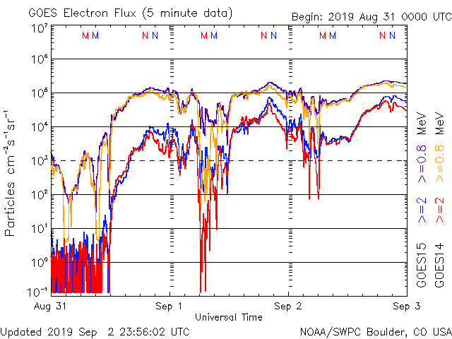(c) NOAA/SWPC ![]() GOES衛星による、静止衛星軌道における高エネルギー電子の変化 (c) NOAA/SWPC ![]() | ||||||||||||||||||||||||||||||||||||||||||||||||||||||||||||||||||||||||||||||||||||||||||||||||||||||||||||||||||||||||||||||||||||||||||||||||||||||||||||||||||||||||||||||||||||||||||||||||||||||||||||||||
