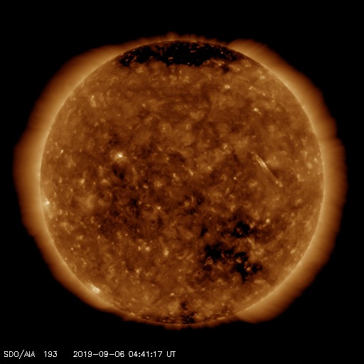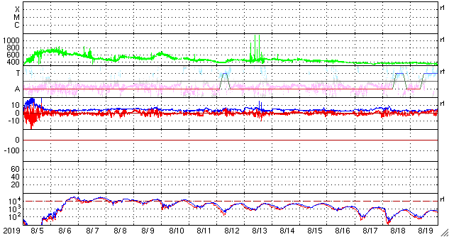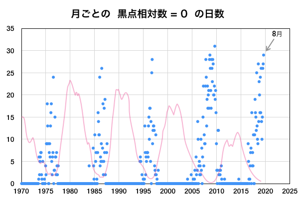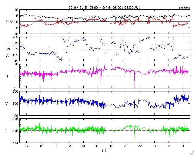 2019/ 9/ 6 13:56 更新 500km/秒前後の高速太陽風が続いています。8月の黒点数は 0.7 でした。 担当 篠原 WDC-SILSOより、 8月の黒点相対数の月平均値は、 0.7 と発表されました。 7月に続いて、1 を割るかなり低い値になっています。 1未満になったのは、今極小期では3回目で(2月の0.8、7月の0.9)、 この中では最低の値です。 前の極小期(第23〜24期)でも、4回しか起きていないのですが、 記録としてはかなり近付いています。 一方、前の極小期の4回の値は、0.6、0.3、0.6、0.0 と、 全て今回よりも更に低い値でした。 そして、無黒点(黒点相対数=0)の日は、29日に達しました。 今極小期では、最多の日数です。 前の極小期でも、この日数に達したのは、 2008年8月の同じ29日、2009年8月の31日(1か月無黒点でした) の2回だけです。 (偶然だと思いますが、全て8月でした) 前回の極小は、この2つの8月の間に発生しました。 今期の極小も近付いているのかもしれません。 高速の太陽風が続いています。 速度は、500km/秒付近を上下しながら推移しています。 磁場強度は、5nTから3nTに少し下がり、再び5nTに戻っています。 磁場の南向きの変化は、グラフの中盤では見られなくなっていて、 AE指数の変化も、この頃にかけて小さくなっています。 太陽風のグラフの最後で、再び南向きに振れ始めているので、 この傾向が続くと、磁気圏の活動もある程度高まりそうです。 太陽は、無黒点です。 西側(右側)の中央部で、小規模の爆発現象が発生しています。 弱いCME(太陽ガスの放出現象)も起きているかもしれません。 放射線帯の高エネルギー電子は、大きく下がって、 GOES15の青線が1万にやっと届く位に減少しています。 ![]() 太陽黒点相対数の長期変化。8月の黒点相対数は 0.7 でした。 (c) 黒点データ:WDC-SILSO、作図:宇宙天気ニュース ![]() 1970年以降の太陽黒点相対数の長期変化。 (c) 黒点データ:WDC-SILSO、作図:宇宙天気ニュース ![]() 1970年以降の月毎の無黒点日の日数。 (c) 黒点データ:WDC-SILSO、作図:宇宙天気ニュース ![]() SDO衛星のAIA193カメラによる太陽コロナの様子 (c) SDO (NASA) ![]() SDO衛星による太陽の可視光写真 (c) SDO (NASA) ![]() DSCOVRが観測した太陽風の磁場(1番上の枠、黒線は全体の強度、赤線は南北成分) および、太陽風の密度(3番目の紫線)、速度(4番目の青線) (c) データ:NOAA/SWPC、作図:宇宙天気ニュース ![]() AE指数(速報値) 下段のAEグラフの値が高くなると、オーロラ活動が活発化しています。 (c) 京都大学WDC ![]() ![]() 27日の太陽周期に合わせたデータプロット 太陽が同じ面を地球に向けていた27日前の変化から、今後を予想することができます。 (c) 作図:宇宙天気ニュース