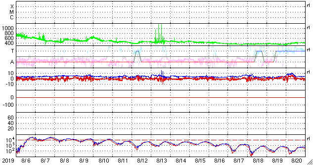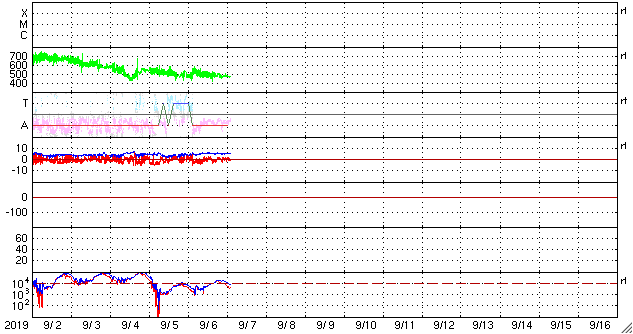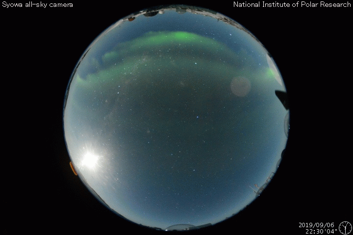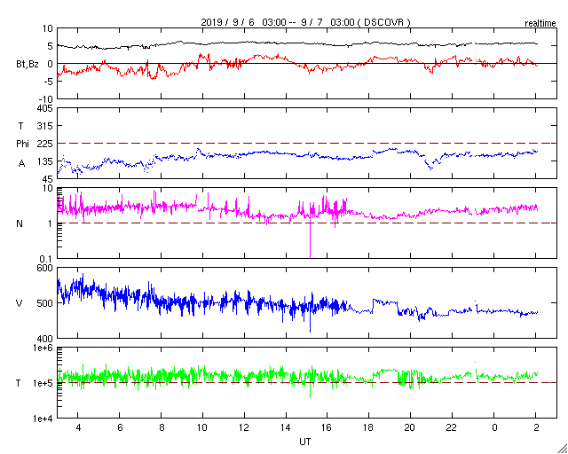 2019/ 9/ 7 11:17 更新 太陽風は速度が少し下がって、やや高速の状態です。 担当 篠原 太陽風の速度は、500km/秒から470km/秒へ少し下がり、 やや高速の状態です。 27日周期の図を見ると、 前周期の太陽風もこの辺りで500km/秒台を割り、 以降、450km/秒付近で推移しています。 今回も同様の変化になるのかもしれません。 太陽風の磁場強度は、5nTと平均的な状態が続いています。 南北成分の南向きの変化はあまり見られず、 磁気圏も次第に穏やかになっています。 AE指数は、時々、小中規模の変化が起きている程度です。 目立った変化ではありませんが、 世界時6日22時半頃に、南極の昭和基地で撮影された オーロラの動画を掲載します。 AE指数は小さい変化に留まっていますが、 なかなかきれいなオーロラです。 例年通りであれば、 昭和基地のオーロラの撮影は残り1か月程度です。 SDO衛星AIA193では、太陽の中央部から東側(左側)にかけて、 コロナがぼんやり光っているだけで、コロナホールは見られません。 今回の太陽風の高まりが終わると、 太陽風は穏やかな状態がしばらく続きそうです。 太陽は、無黒点で穏やかです。 ![]() 南極・昭和基地の全天カメラで、世界時6日22時半に撮影されたオーロラ。 (c) 国立極地研究所、(動画加工 : 宇宙天気ニュース) ![]() SDO衛星のAIA193カメラによる太陽コロナの様子 (c) SDO (NASA) ![]() SDO衛星による太陽の可視光写真 (c) SDO (NASA) ![]() DSCOVRが観測した太陽風の磁場(1番上の枠、黒線は全体の強度、赤線は南北成分) および、太陽風の密度(3番目の紫線)、速度(4番目の青線) (c) データ:NOAA/SWPC、作図:宇宙天気ニュース ![]() AE指数(速報値) 下段のAEグラフの値が高くなると、オーロラ活動が活発化しています。 (c) 京都大学WDC ![]() ![]() 27日の太陽周期に合わせたデータプロット 太陽が同じ面を地球に向けていた27日前の変化から、今後を予想することができます。 (c) 作図:宇宙天気ニュース