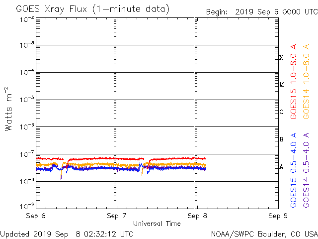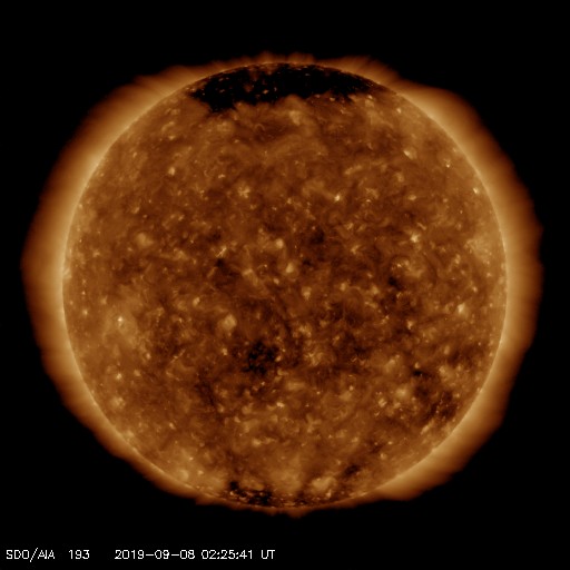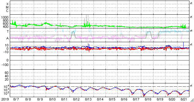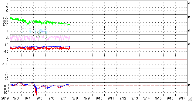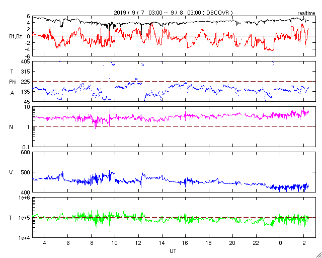 2019/ 9/ 8 11:39 更新 太陽風は平均的な状態に戻りました。太陽は無黒点です。 担当 篠原 太陽風の速度は430km/秒まで下がり、 平均的な速さに戻っています。 8月31日くらいから始まった太陽風速度の高まりは、 8日間ほど続きました。 磁場強度も、4〜5nTと平均的な状態です。 南北成分は、-3〜 -4nT程度の南向きが度々発生していて、 AE指数は、400nT程度の変化が繰り返し発生しています。 小規模ですが、ある程度活動的です。 SDO衛星AIA193の太陽コロナ写真では、 北極にコロナホールが見えていますが、 低緯度域はぼんやりと光っているだけです。 この後は、穏やかな太陽風が続きそうです。 27日周期の図でも、 前周期の太陽風は400km/秒前後の状態が続いています。 太陽は無黒点で、穏やかな状態が続いています。 放射線帯の高エネルギー電子は、 1万を超えるくらいで推移しています。 ゆっくりと減少するでしょう。