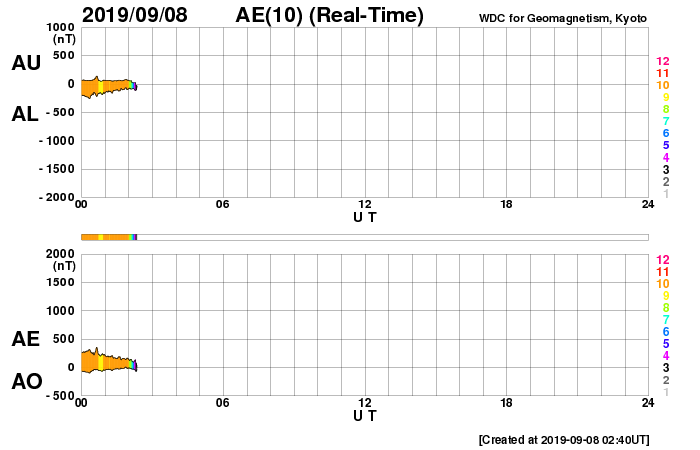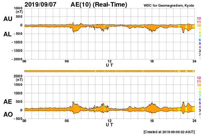 (c) SDO (NASA) ![]() SDO衛星による太陽の可視光写真 (c) SDO (NASA) ![]() DSCOVRが観測した太陽風の磁場(1番上の枠、黒線は全体の強度、赤線は南北成分) および、太陽風の密度(3番目の紫線)、速度(4番目の青線) (c) データ:NOAA/SWPC、作図:宇宙天気ニュース ![]() AE指数(速報値) 下段のAEグラフの値が高くなると、オーロラ活動が活発化しています。 (c) 京都大学WDC ![]() ![]() 27日の太陽周期に合わせたデータプロット 太陽が同じ面を地球に向けていた27日前の変化から、今後を予想することができます。 (c) 作図:宇宙天気ニュース