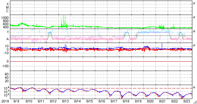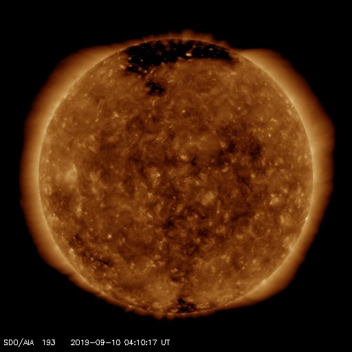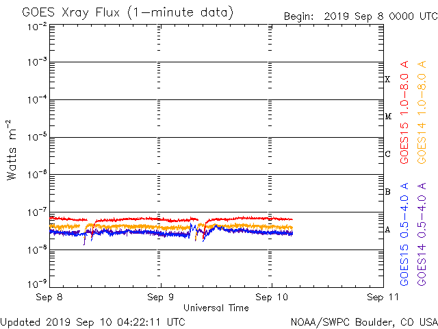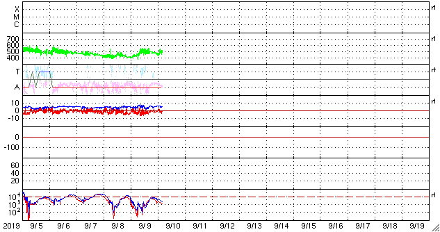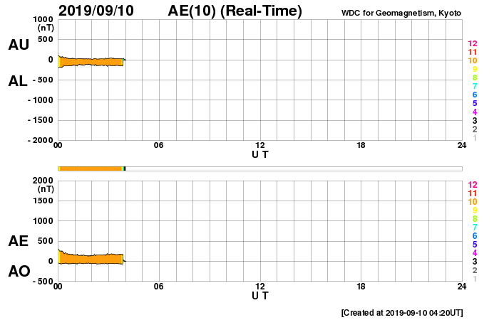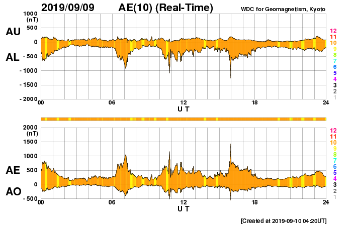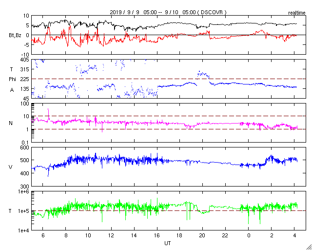 2019/ 9/10 13:27 更新 太陽風の速度は500km/秒に高まっています。イエローナイフのオーロラをどうぞ。 担当 篠原 昨日に続いて、高坂雄一さんよりお送りいただいた、 カナダ・イエローナイフで現地6日の夜(世界時7日午前)に撮影された オーロラの写真を紹介します。 前日と違って、この日の太陽風は速度が400km/秒台後半に下がり、 AE指数の変化も300〜500nTと一段弱くなっていました。 高坂さんも、磁気圏の活動度が下がっていることを把握していて、 オーロラの変化には期待していなかったそうですが、 実際にはピンクの発色がとても多く、 頭上で何度もグルグルと回り続けていたそうです。 高いところの赤色や、緑の下のピンクなど、 彩りの鮮やかなオーロラです。 指数を参考にしながらも、実際に空を見ることが大切なのですね。 美しい写真をありがとうございます。 昨日、420km/秒と平均的な速さになっていた太陽風の速度は、 ニュースの後に再び高まり、520km/秒の高速風になりました。 その後、今朝にかけて460km/秒へ下がって行ったのですが、 グラフの最後でまた500km/秒に戻っています。 前周期も400km秒台後半を推移していたのですが、 その高まりが今回も続いている様です。 AE指数は、瞬間的に1000nTに達する変化など、 500nTを超える変化が繰り返し発生しています。 磁気圏活動の高まりは続いている様です。 前周期の太陽風は、もう2日ほど400km/秒台を保って、 その後300km/秒台に下がっています。 今回も同様の変化になるのでしょうか。 太陽は無黒点で、穏やかな状態が続いています。 放射線帯の高エネルギー電子は、少し下がって、 2つの衛星とも1万に届かなくなっています。